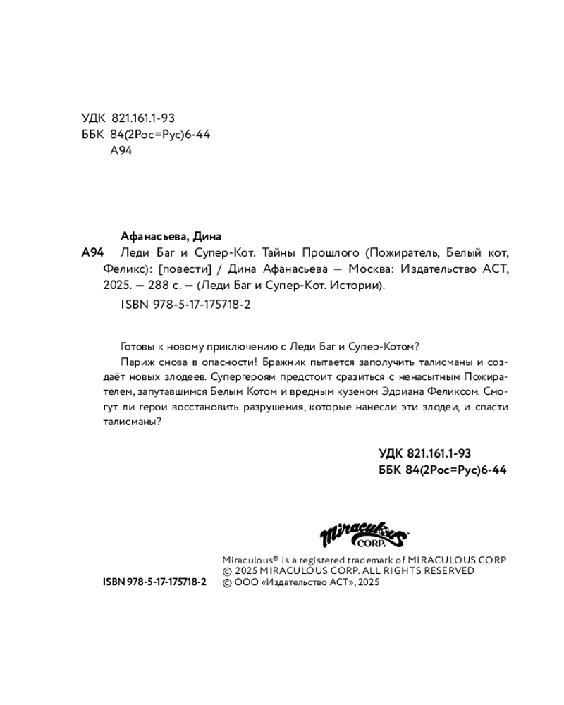 Серия: Леди Баг и Супер-Кот. Истории Готовы к новому приключению с Леди Баг и Супер-Котом? Париж снова в опасности! Бражник пытается заполучить талисманы и создаёт новых злодеев. Супергероям предстоит сразиться с ненасытным Пожирателем, запутавшимся Белым Котом и вредным кузеном Эдриана Феликсом. Смогут ли герои восстановить разрушения, которые нанесли эти злодеи, и спасти талисманы? |