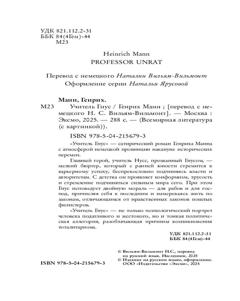 Серия: Всемирная литература (новое оформление) «Учитель Гнус» — сатирический роман Генриха Манна с атмосферой немецкой провинции накануне исторических перемен. Главный герой, учитель Нусс, прозванный Гнусом, — мелкий бюргер, который с ранней юности стремится к карьерному успеху, беспрекословно подчиняясь власти и авторитетам. С детства он проявляет конформизм, трусость и стремление подчиняться сильным мира сего. При этом Гнус исповедует двойную мораль — для рабов и для господ, причисляя себя к последним и намереваясь жить по законам, отличающимся от нравственных законов пошлых филистеров. «Учитель Гнус» — не только психологический портрет человека податливого и жестокого, но и тонкая политическая аллегория, разоблачающая причины возникновения тоталитаризма. |