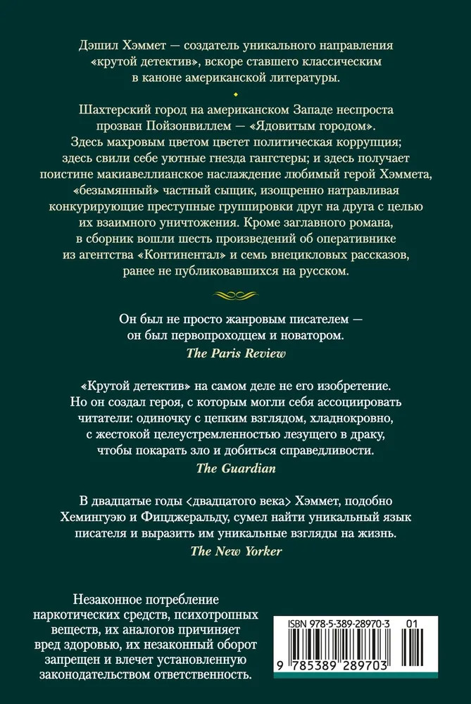 Серия: Классика детектива. Большие книги Шахтерский город на американском Западе неспроста прозван Пойзонвиллем — «Ядовитым городом». Здесь махровым цветом цветет политическая коррупция; здесь свили себе уютные гнезда гангстеры; и здесь получает поистине макиавеллианское наслаждение любимый герой Хэммета, «безымянный» частный сыщик, изощренно натравливая конкурирующие преступные группировки друг на друга с целью их взаимного уничтожения. |