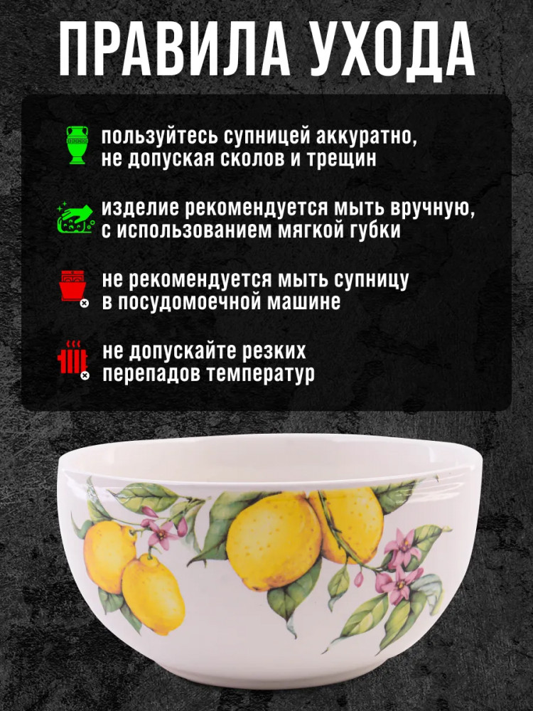💳 Оплатить за товар можно при получении 🇰🇿 Есть бесплатная доставка по Казахстану 🎁 Копите бонусы с каждой покупки Серия: Лимонный праздник Супница Loraine поможет создать особенную сервировку стола, делая дни красочнее и ярче. Эстетичная тарелка глубокая изготовлена из БИО и ЭКО доломитовой керамики высокого качества и украшена красивым рисунком. Доломит один из лучших материалов для использования в быту, долго сохраняет тепло, долговечен и отлично впишется в любой интерьер кухни. Такие тарелки для супа обладает термической и химической прочностью, поэтому прослужит Вам по-настоящему долго. Супница доломитовая предназначена для подачи супа, бульона, салата, каши, окрошки, соуса или крема. Тарелка суповая идеальный вариант для подачи первых блюд в кругу семьи, с родными и друзьями. Изделие упаковано в индивидуальную коробку. Оригинальный дизайн и качество исполнения сделают суповую тарелку настоящим украшением стола и подчеркнет прекрасный вкус хозяйки, а также станет отличным подарком. |