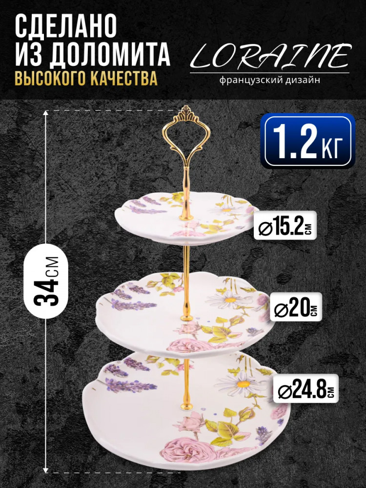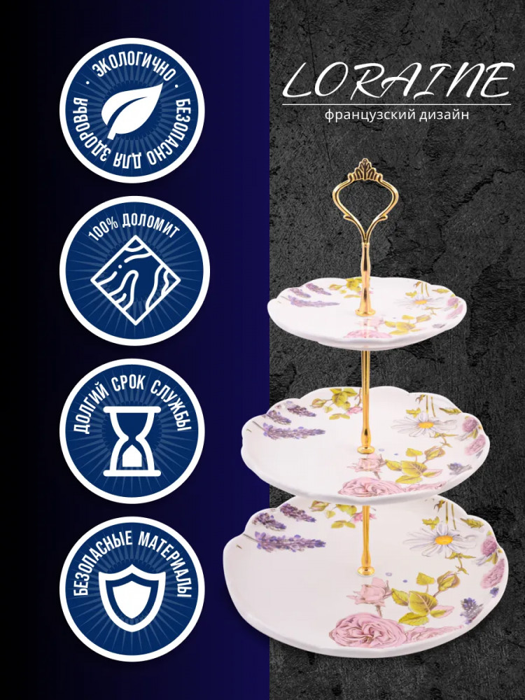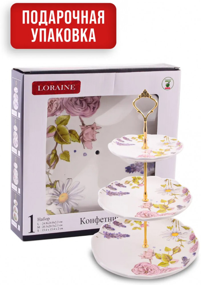 Серия: Розовый сад Элегантная конфетница с тремя ярусами Loraine станет настоящим украшением любого стола, поможет хозяйке красиво подать конфеты, фрукты, орехи, выпечку, овощи и даже закуски из мясных и сырных деликатесов. Блюдо выполнено из БИО и ЭКО доломитовой керамики высокого качества и украшена красивым цветочным рисунком с бабочками. Стойка-держатель выполнена из металла с золотым покрытием. Благодаря своей трехъярусной конструкции, этажерка на стол позволит вам разместить большое количество сладостей. Основание фруктовницы обеспечивает ей высокую устойчивость, что делает ее безопасной для использования даже на самых неровных поверхностях. Вы можете быть уверены, что ваша ваза для фруктов будет стоять надежно, не опасаясь, что она может перевернуться или сломаться. Фруктовница трехъярусная прекрасно подойдёт под любой интерьер и будет сочетаться с сервировочной посудой, а компактные размеры позволят разместить ее даже на небольшом праздничном столе. Эта красивая посуда для дома украсит сервировку вашего стола и подчеркнет прекрасный вкус хозяина, а также станет отличным подарком. |