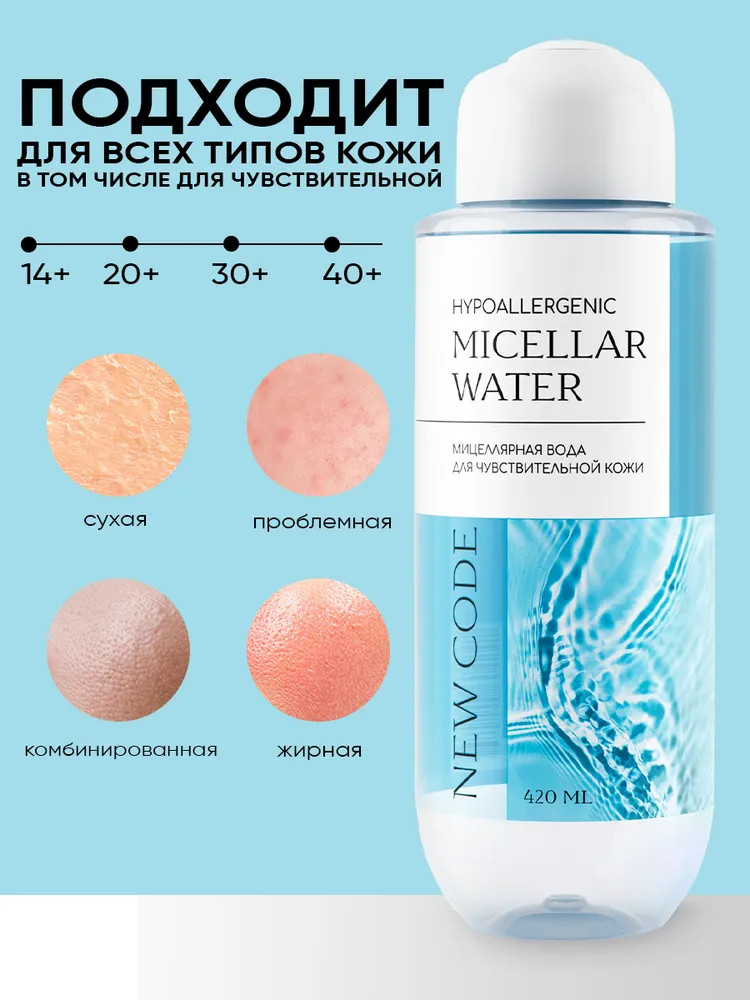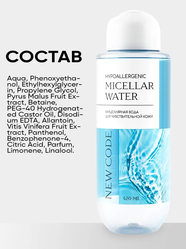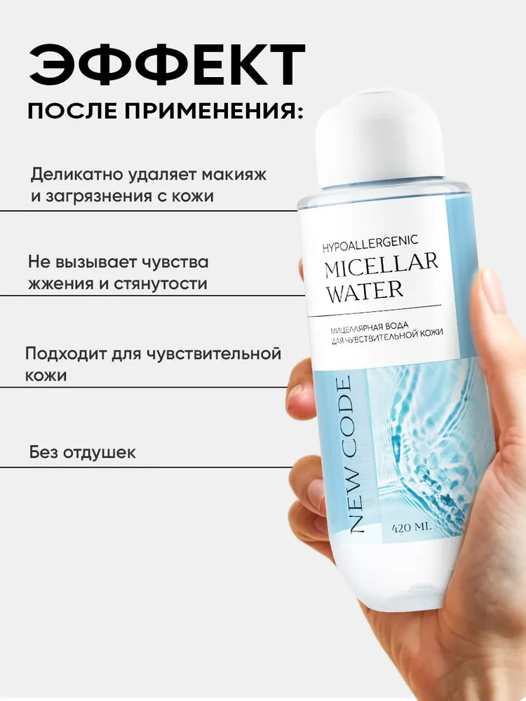 Продукт универсален и прекрасно справляется с задачей снятия водостойкого макияжа, не повреждая защитный барьер кожи. Он подходит для ухода за чувствительной кожей благодаря своему мягкому составу без агрессивных компонентов. Мицеллярка является важным этапом ухода за лицом, обеспечивая кожу чистотой, свежестью и здоровым сиянием. Благодаря этому средству вы сможете сохранить молодость и упругость кожи на длительное время. Используйте сначала очищающее средство для удаления косметики мицеллярку нью код, гель для умывания и затем освежающий тоник нью код для подготовки к следующему этапу ухода за лицом. Жидкость работает бережно даже с водостойкими средствами декоративной косметики. Мягкая текстура средства позволяет избежать трения при снятии макияжа с глаз или губ.
