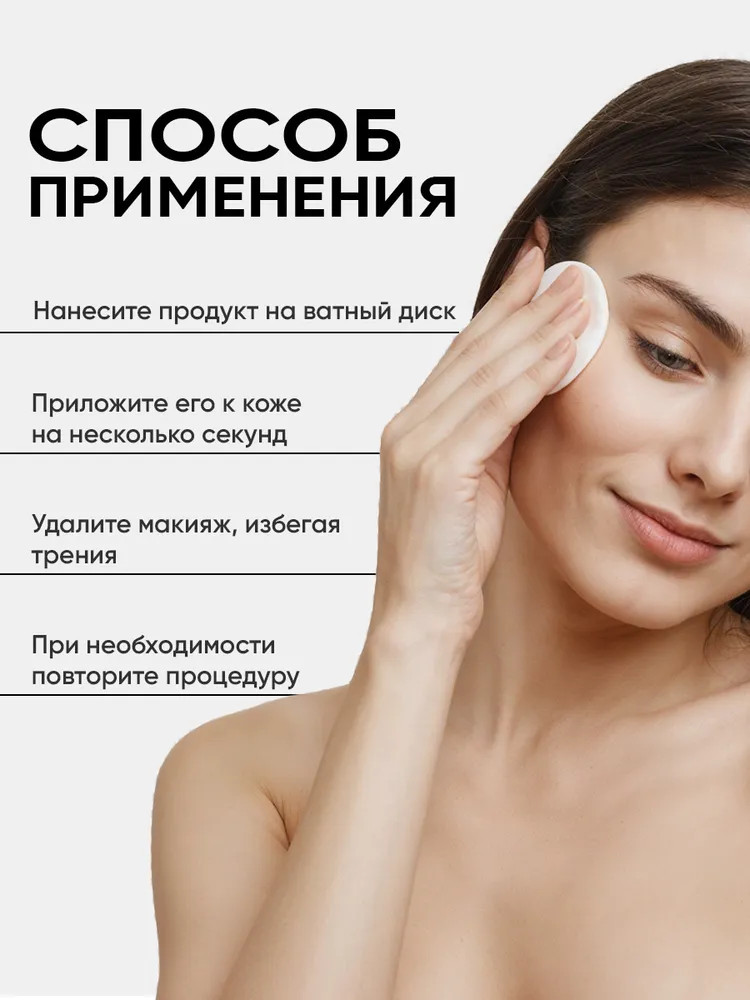 Способ применения: смочите ватный диск водой и бережно без лишнего трения, очистите кожу лица, глаза и губы.