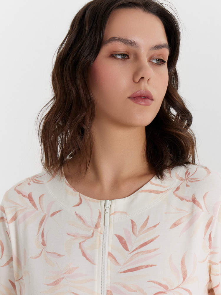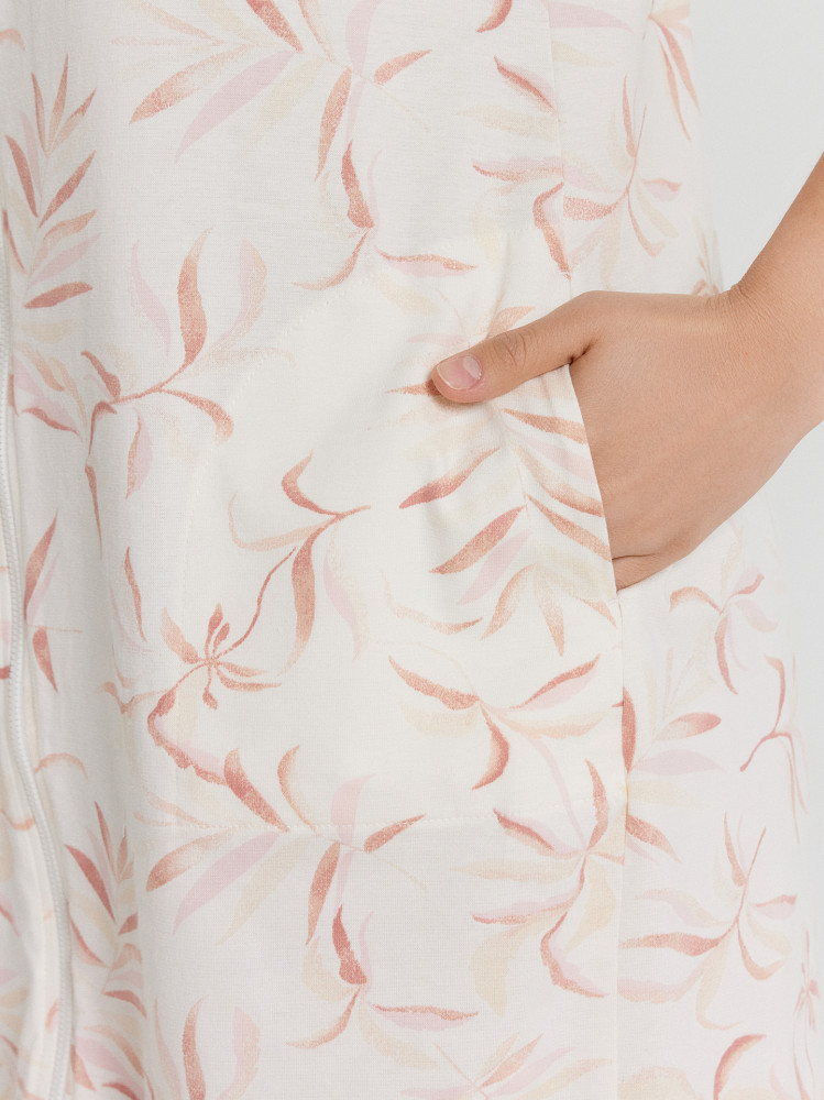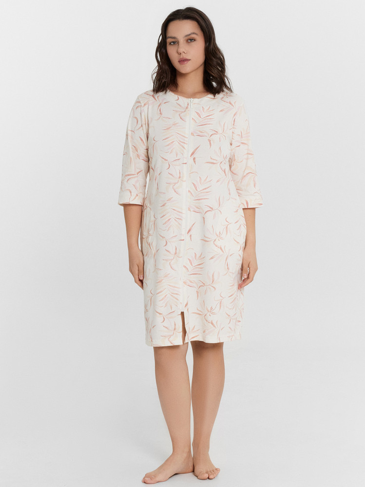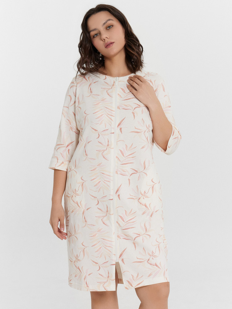 Красивый женский халат с коротким рукавом из высококачественного хлопка станет идеальным выбором для вашего гардероба. Прямой силуэт и длина ниже колена обеспечивают элегантный и уютный вид, а застежка на молнию спереди делает модель удобной в использовании. Два функциональных и вместительных боковых кармана добавляют практичности. Хлопок является отличным материалом для халатов, так как он хорошо впитывает остатки влаги, быстро сохнет и позволяет коже дышать. Надевайте халат после бани, сауны, СПА, ванны и душа — в нем всегда тепло и уютно. Этот халат идеально подходит для беременных и кормящих девушек, а также для роддома. Широкая линейка домашней одежды Mark Formelle предлагает красивые варианты в базовых цветах и с различными принтами. Купите этот халат для уютного и комфортного времяпрепровождения дома и порадуйте себя и своих близких красивой домашней одеждой от Mark Formelle!
