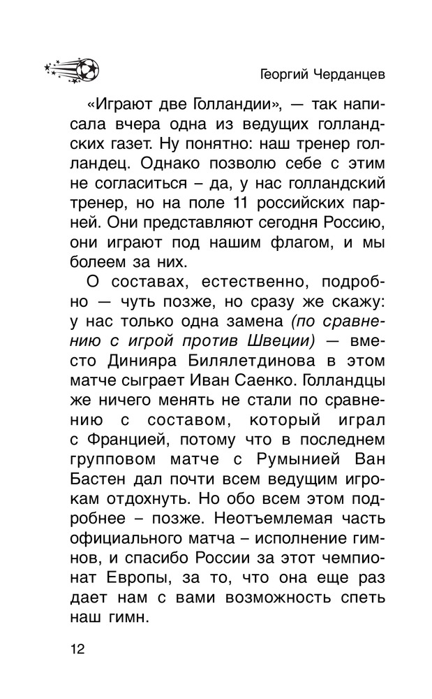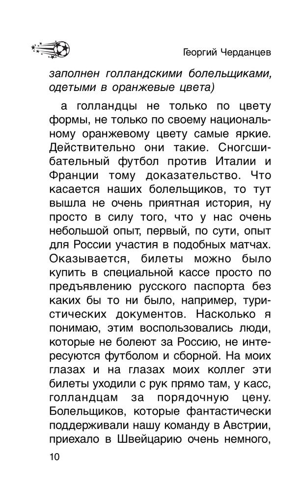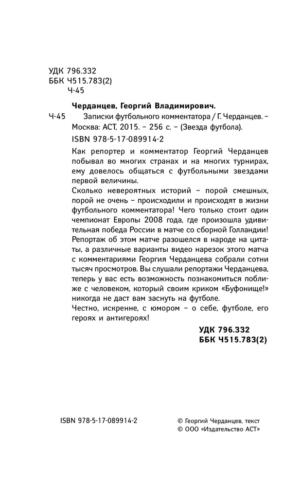 Сколько невероятных историй - порой смешных, порой не очень - происходили и происходят в жизни футбольного комментатора! Чего только стоит один чемпионат Европы 2008 года, где произошла удивительная победа России в матче со сборной Голландии! Репортаж об этом матче разошелся в народе на цитаты, а различные варианты видео нарезок этого матча с комментариями Георгия Черданцева собрали сотни тысяч просмотров. Вы слушали репортажи Черданцева, теперь у вас есть возможность познакомиться поближе с человеком, который своим криком «Буфонище!» никогда не даст вам заснуть на футболе.