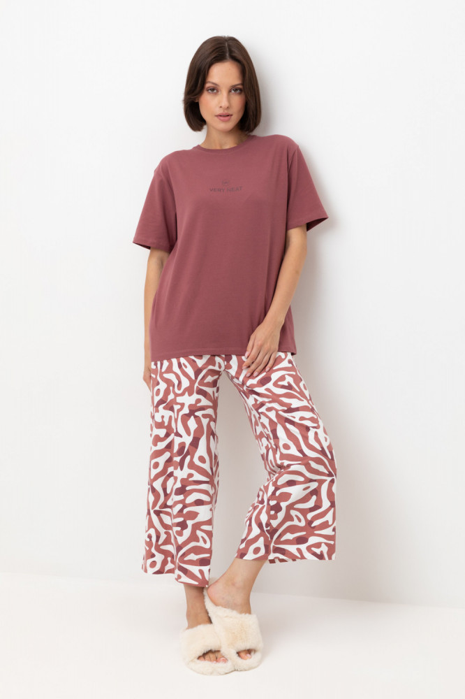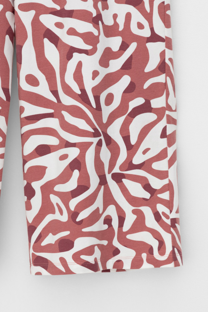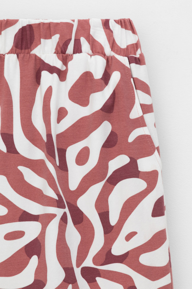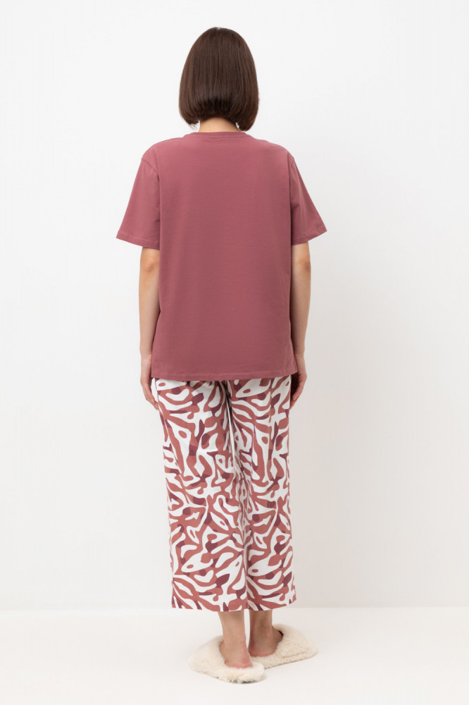 Комплект футболка и брюки выполнен из высококачественного гребенного хлопка. Мягкий на ощупь принт на футболке создан на основе водных красок, что обеспечивает его устойчивость к многократным стиркам. Образ дополняют укороченные брюки с удобным поясом на резинке и практичными карманами. Тип ткани: супрем.