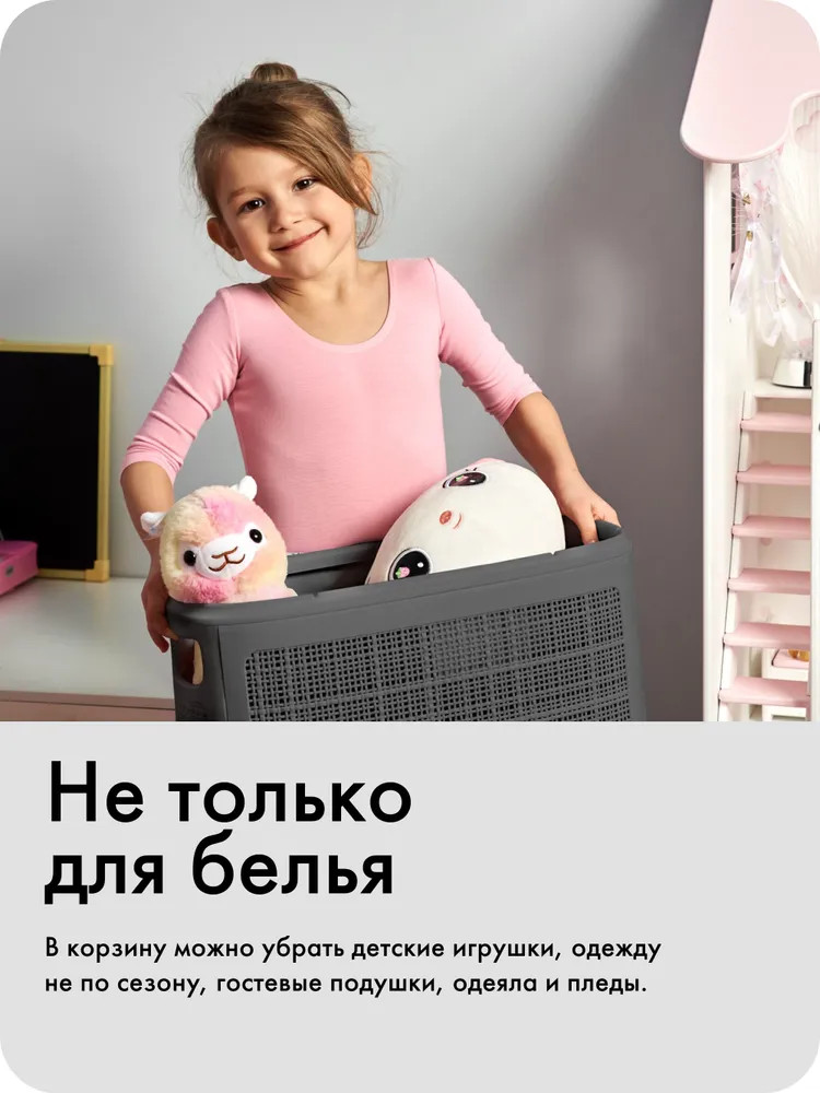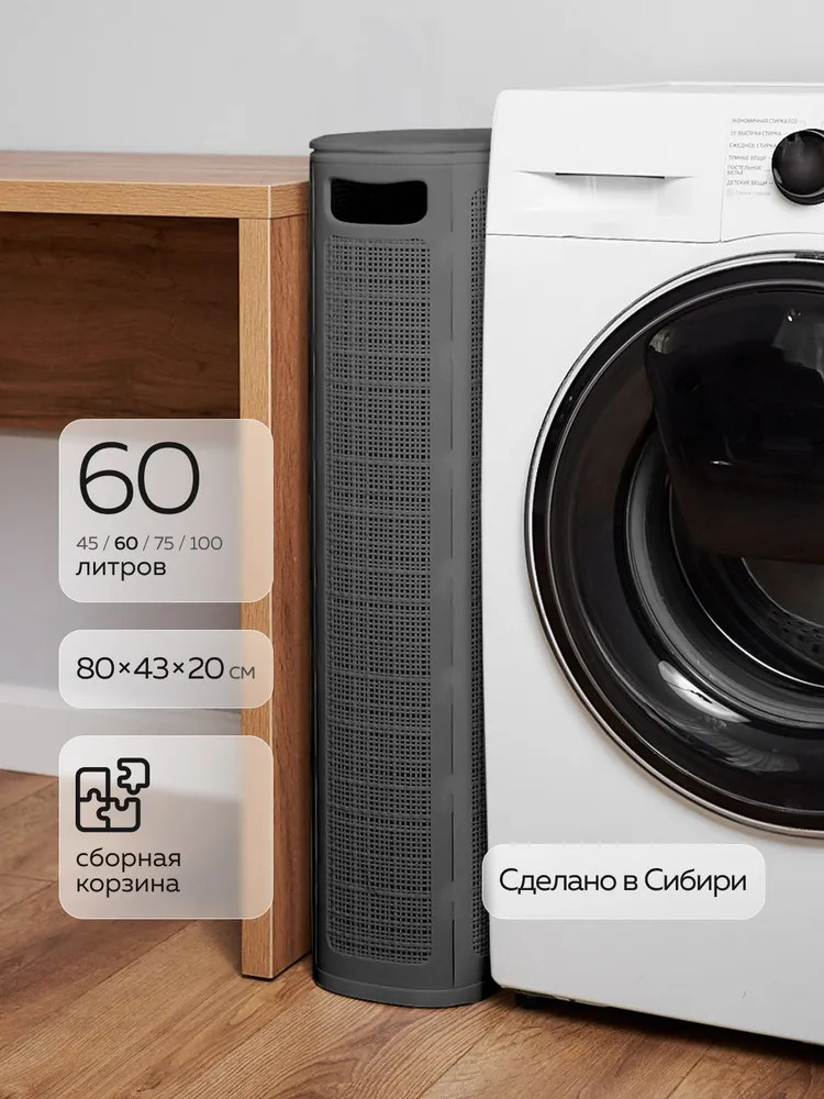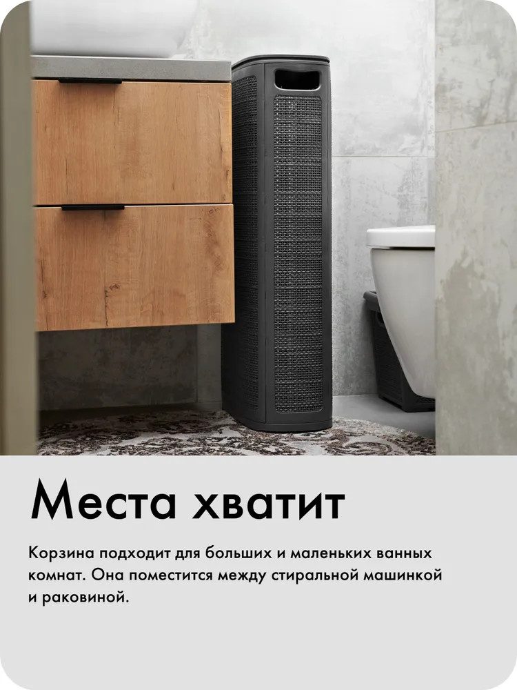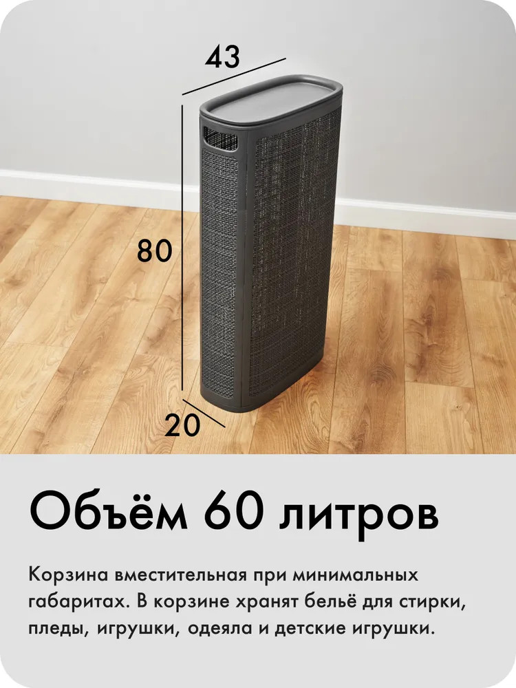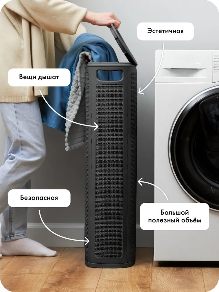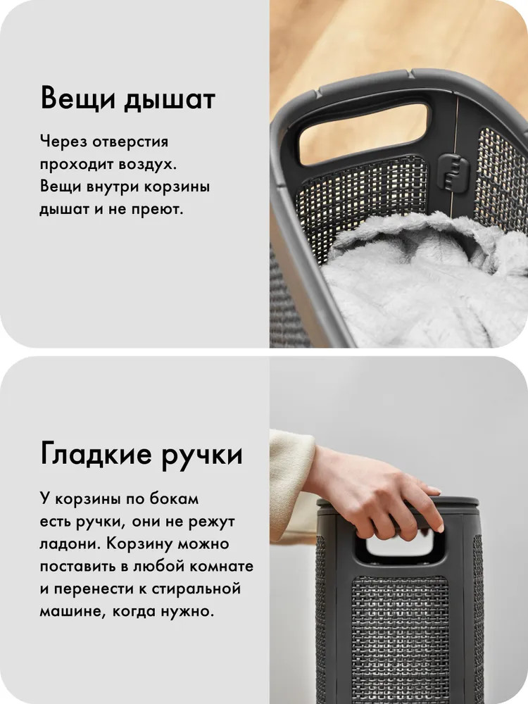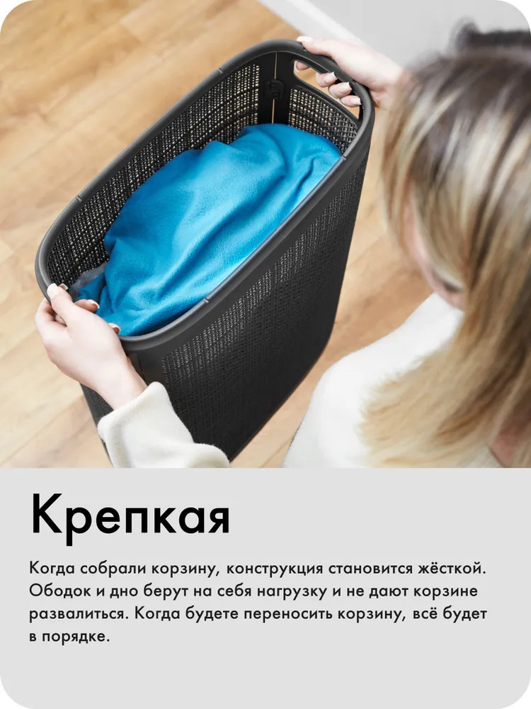 Полезный объём корзины — 60 литров. Через стенки корзины проходит воздух— вещи дышат и не преют. По бокам корзины есть ручки, они не режут ладони. Заполненную корзину можно хранить в любой комнате, а когда нужно, перенести в ванную или постирочную.