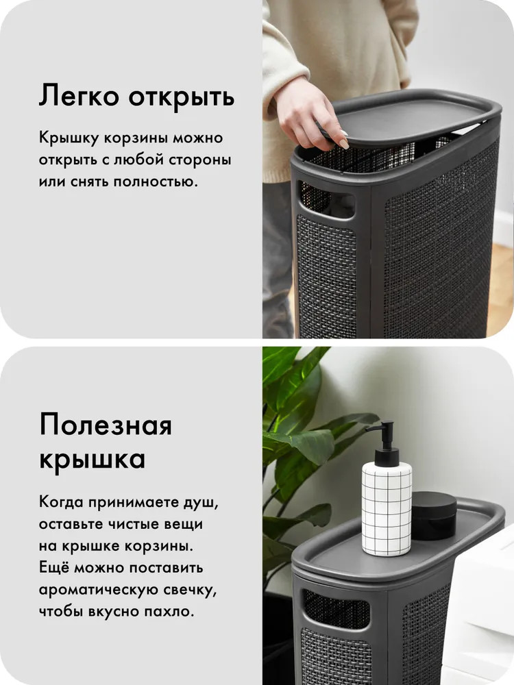 Крышку корзины «Лён» можно открыть с любой стороны или снять полностью. Это удобно, когда в руках много белья. Ещё, крышку используют как дополнительную полку в ванной. Когда принимаете душ можете оставить чистые вещи и телефон на крышке корзины, поставить ароматическую свечку или дозатор с мылом.
