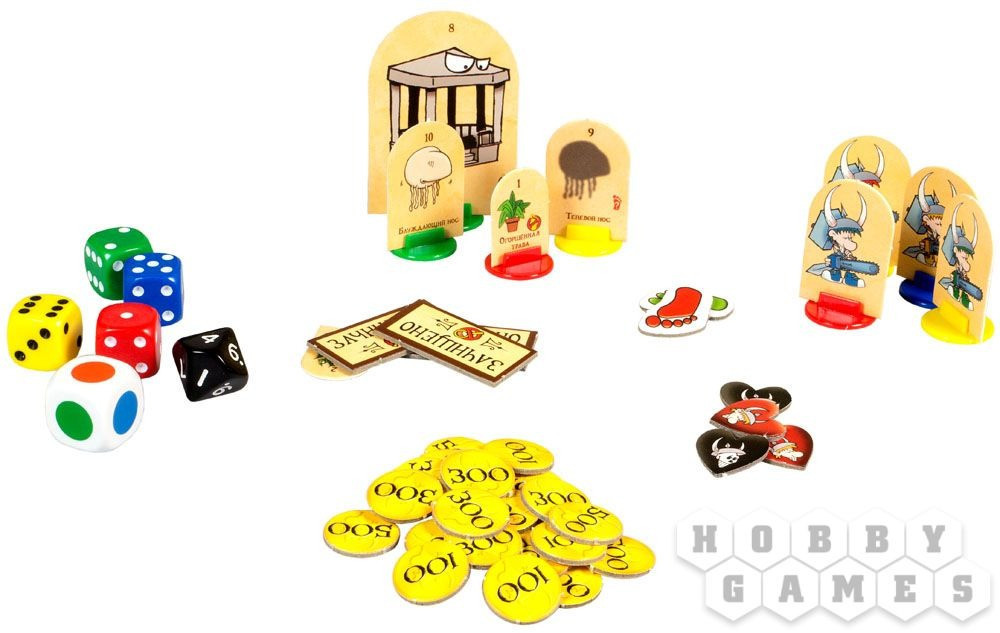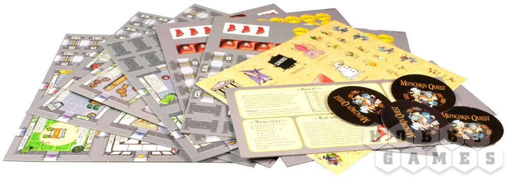Состав набора: 200 карт, 27 жетонов здоровья, 72 жетона золотых монет, 12 жетонов сбитых щитков, 18 жетонов шагов, 12 жетонов результатов обыска, 4 счетчика уровней, 4 жетона маркировки, 16 подставок, 24 комнаты, 1 жетон входа, 38 жетонов монстров, 72 жетона стендов, 10 кубиков, правила игры. |
