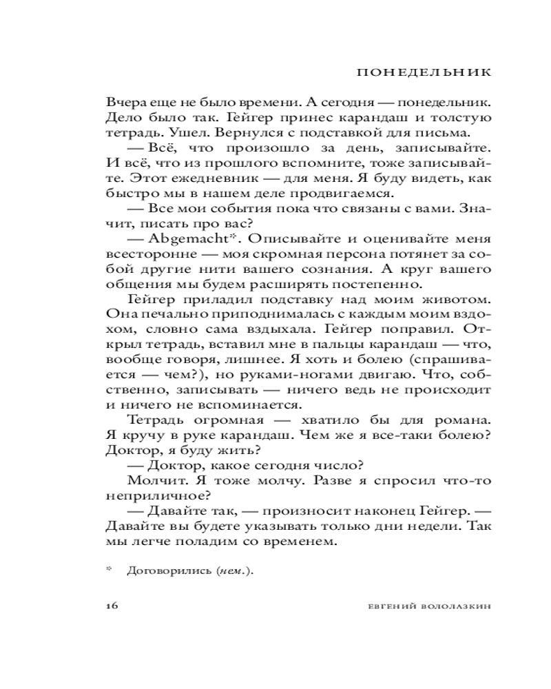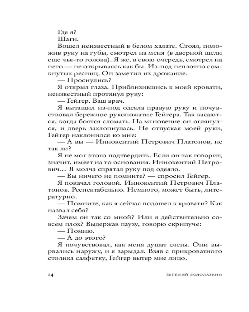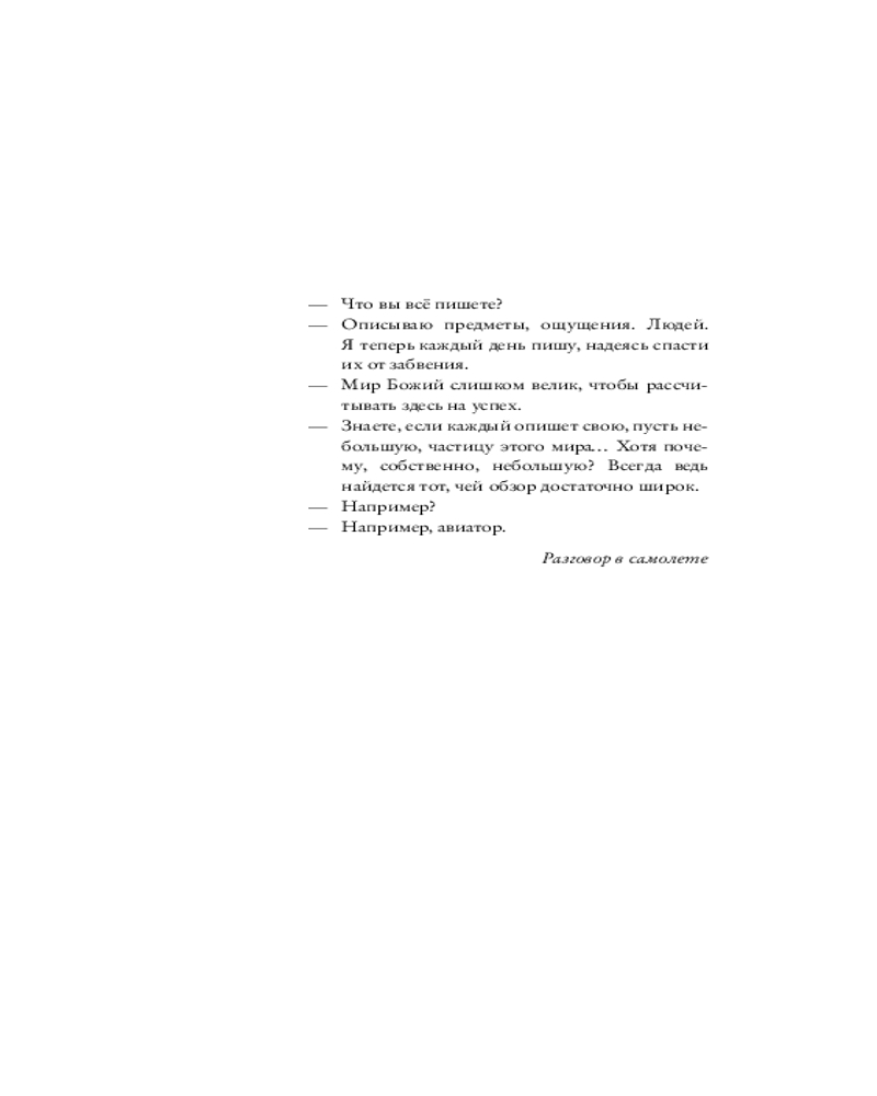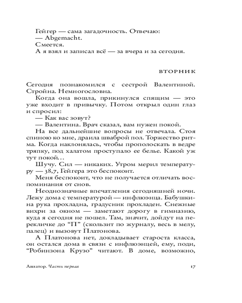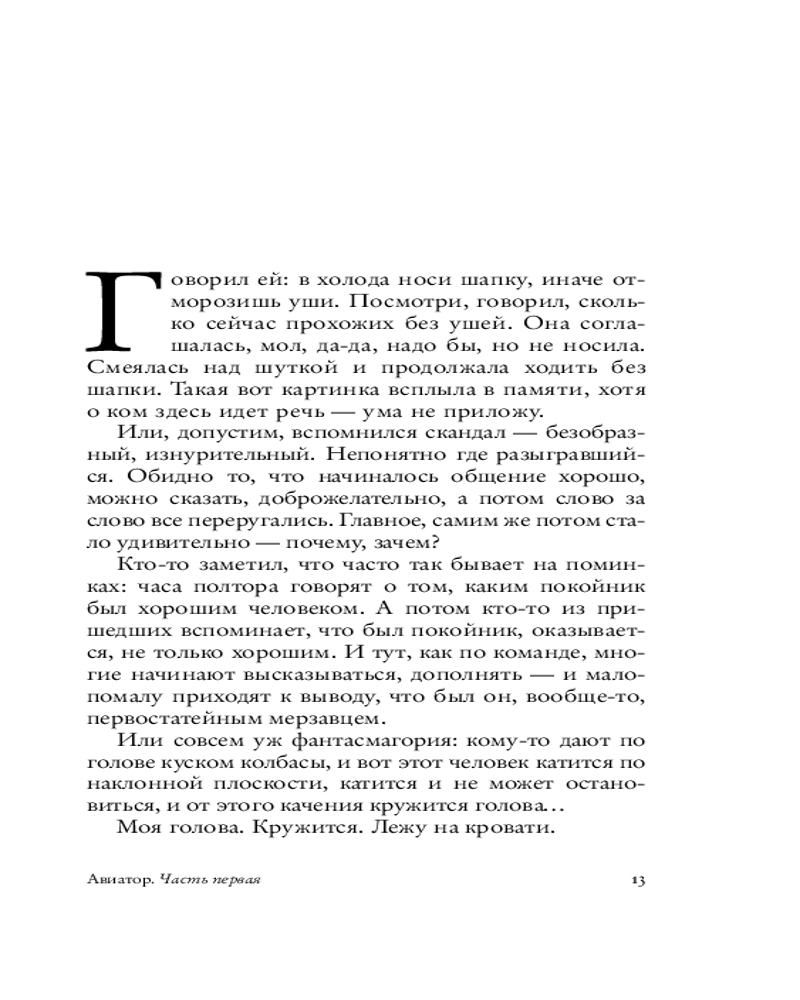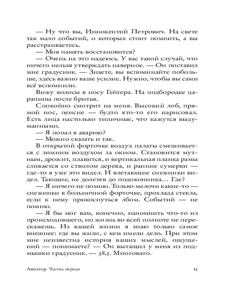 Герой нового романа «Авиатор» — человек в состоянии tabula rasa: очнувшись однажды на больничной койке, он понимает, что не знает про себя ровным счетом ничего — ни своего имени, ни кто он такой, ни где находится. В надежде восстановить историю своей жизни, он начинает записывать посетившие его воспоминания, отрывочные и хаотичные: Петербург начала ХХ века, дачное детство в Сиверской и Алуште, гимназия и первая любовь, революция 1917‑го, влюбленность в авиацию, Соловки... Но откуда он так точно помнит детали быта, фразы, запахи, звуки того времени, если на календаре — 1999 год?..