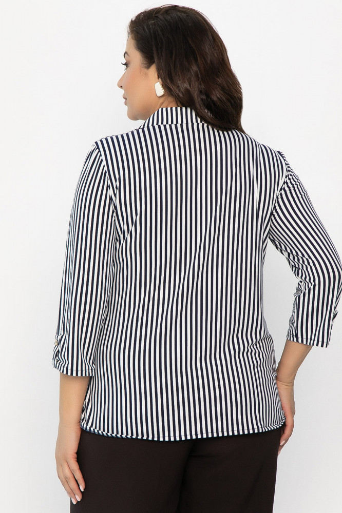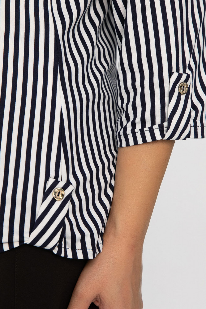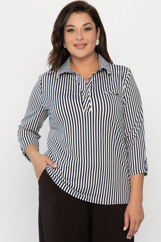 Преобразите свой гардероб с этой элегантной рубашкой, выполненной из натурального материала и вдохновленной морской тематикой! Классический воротник на стойке придает образу строгость, а короткая планка с тремя пуговицами добавляет современный акцент. По низу изделия с боковых сторон расположена пата, которая застегивается на пуговицу. Рукав втачной, длиной 3/4, завершается манжетой на пуговице. По переду есть имитация прорезного кармана в рамку с декоративным элементом в виде металлической вставки. На металлической вставке надпись «любовь» на английском языке. Полосатый принт идеально подчеркивает морскую тематику. Эта рубашка станет отличным выбором для тех, кто ценит сочетание натуральных тканей и оригинальных деталей в своем гардеробе.