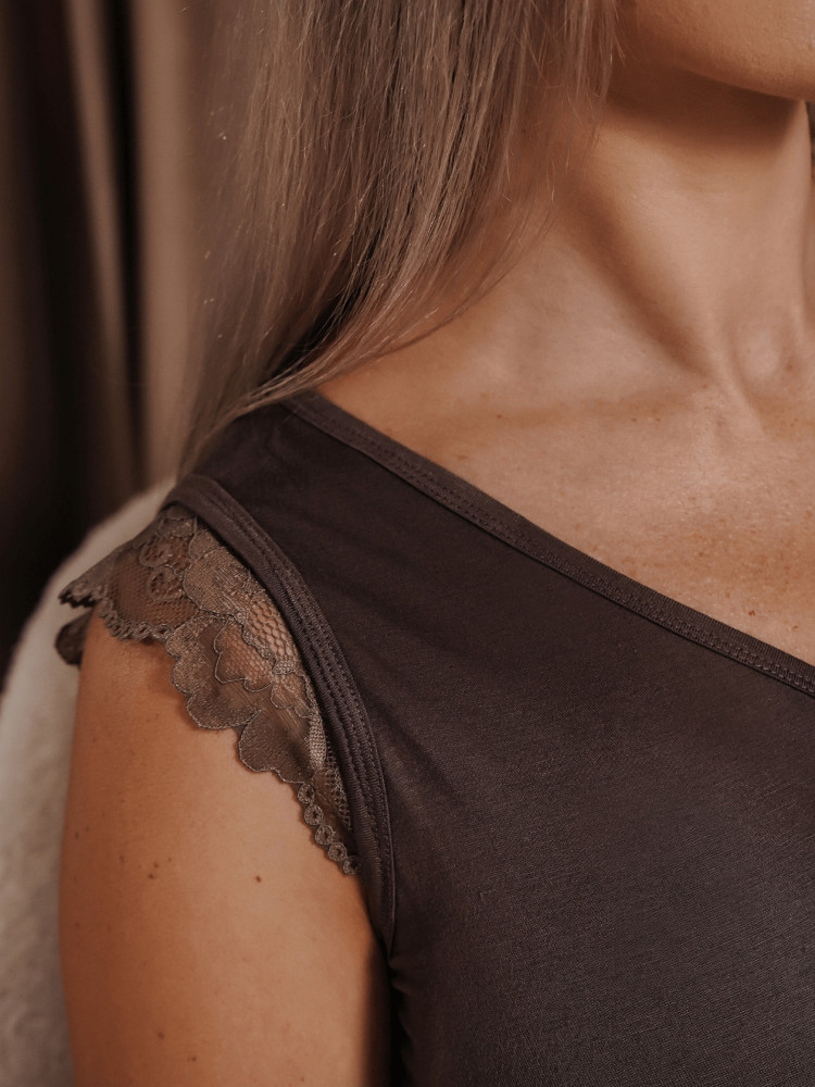 Приятная к телу, очень качественно пошит, кружево нежное, стройнит