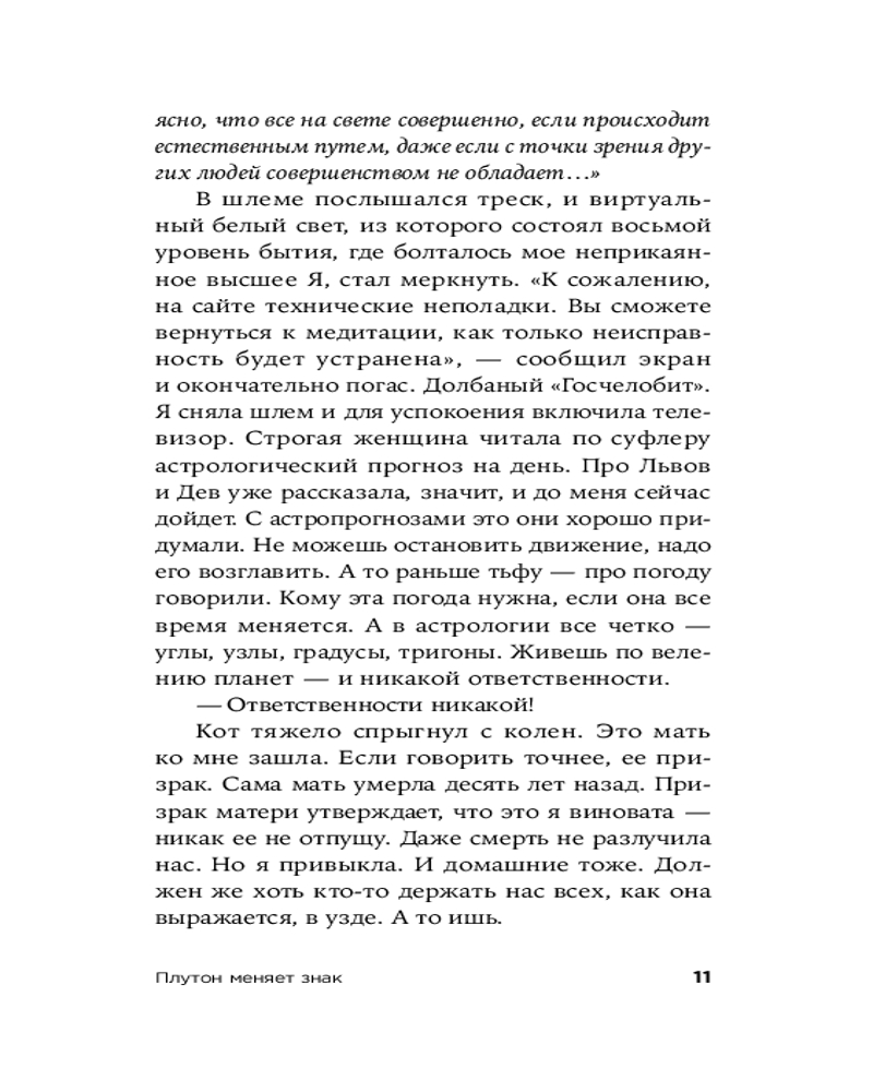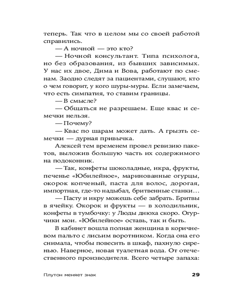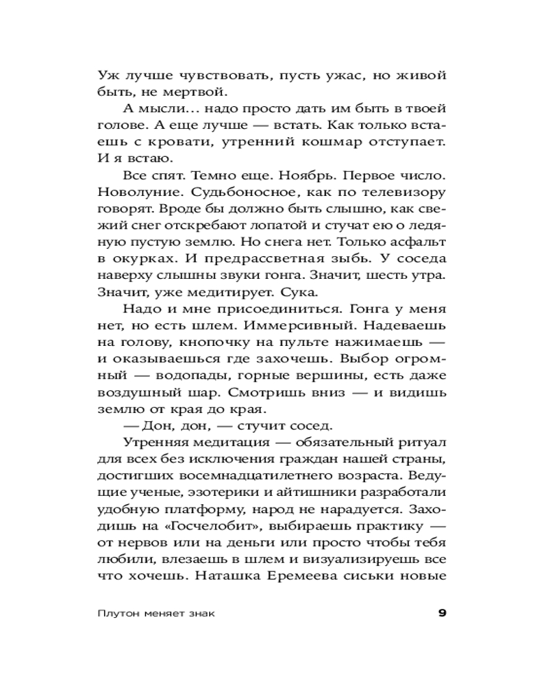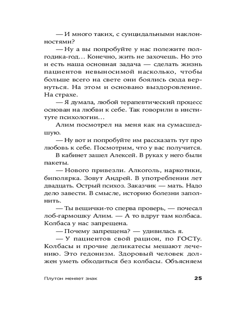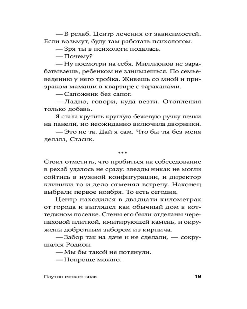 В мире, где каждый шаг регламентирован и больше нет свободного искусства, бывший издатель Анастасия становится клиническим психологом. Ее собственная реальность зыбка и сюрреалистична: в ее квартире живут бывший муж и призрак матери, ее пациенты одержимы нетривиальными зависимостями, ее окружение придает астрологии вес критической рациональности. Но даже в условиях тотального контроля налаженная система однажды дает сбой — и не только потому, что Плутон меняет знак, а значит, все неизбежно придут к всеобщей трансформации, как обещают по телевизору. |