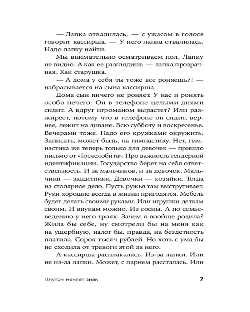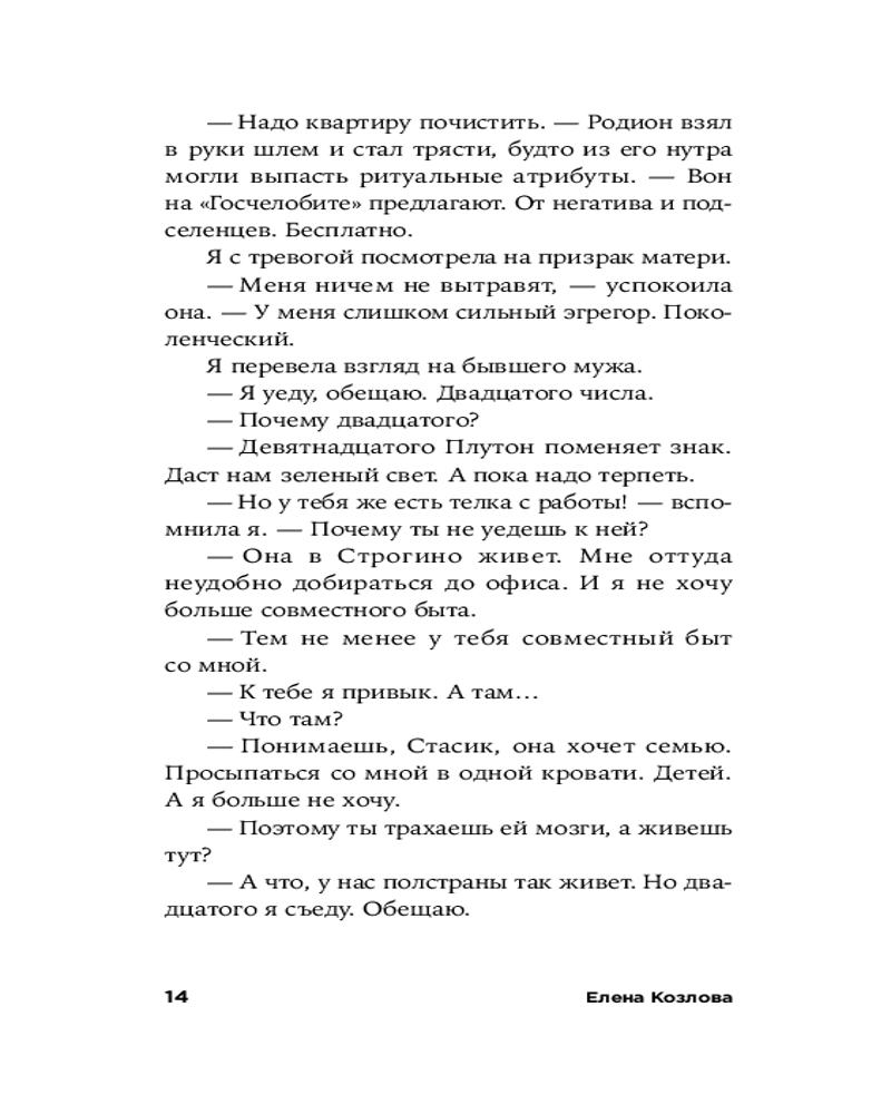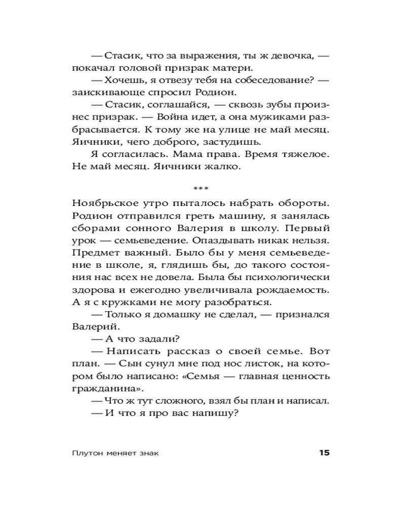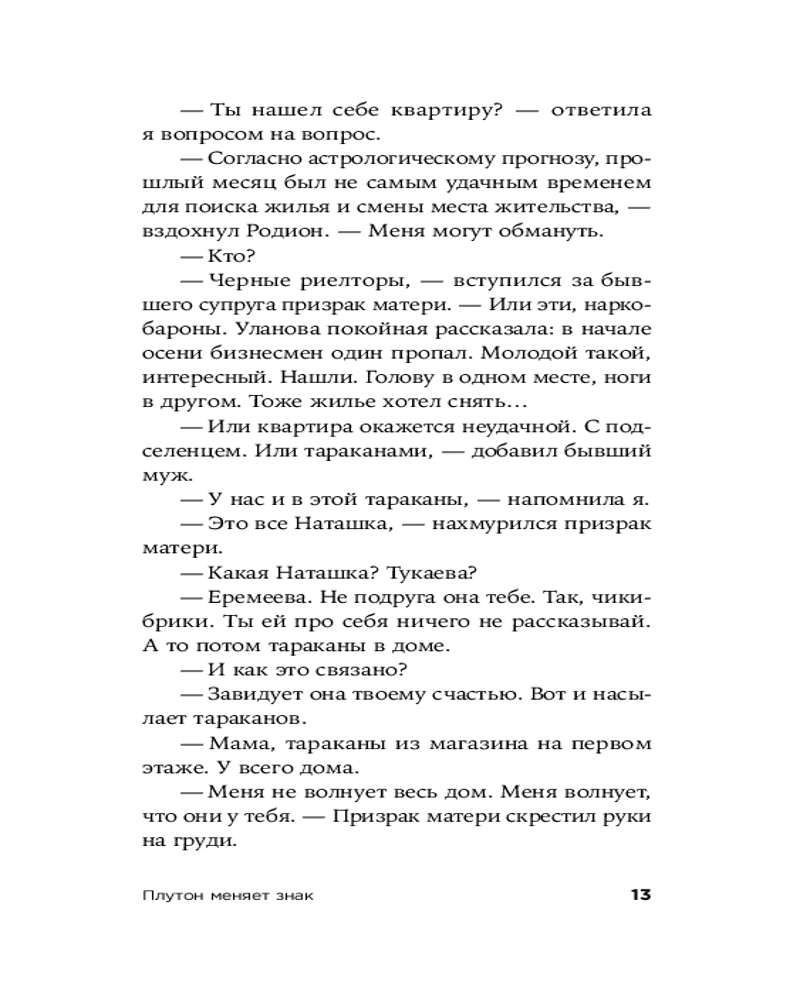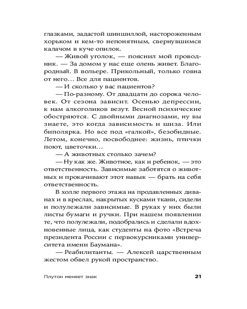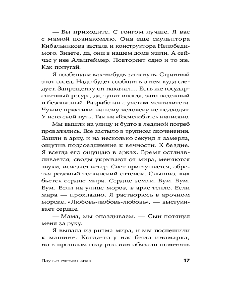 В мире, где каждый шаг регламентирован и больше нет свободного искусства, бывший издатель Анастасия становится клиническим психологом. Ее собственная реальность зыбка и сюрреалистична: в ее квартире живут бывший муж и призрак матери, ее пациенты одержимы нетривиальными зависимостями, ее окружение придает астрологии вес критической рациональности. Но даже в условиях тотального контроля налаженная система однажды дает сбой — и не только потому, что Плутон меняет знак, а значит, все неизбежно придут к всеобщей трансформации, как обещают по телевизору. |