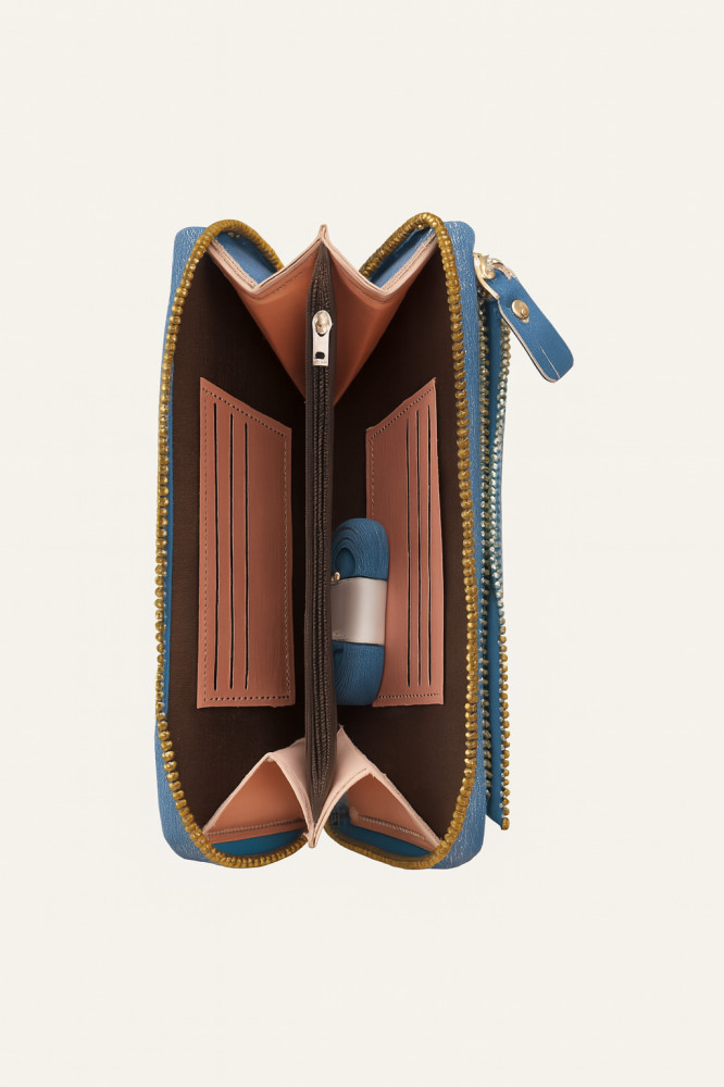 Женский кошелёк-клатч с ремешком — стиль и функциональность в одном аксессуаре. Элегантный кошелёк-клатч с фактурной синей поверхностью и золотистой молнией — идеальное решение для тех, кто ценит порядок и стиль.