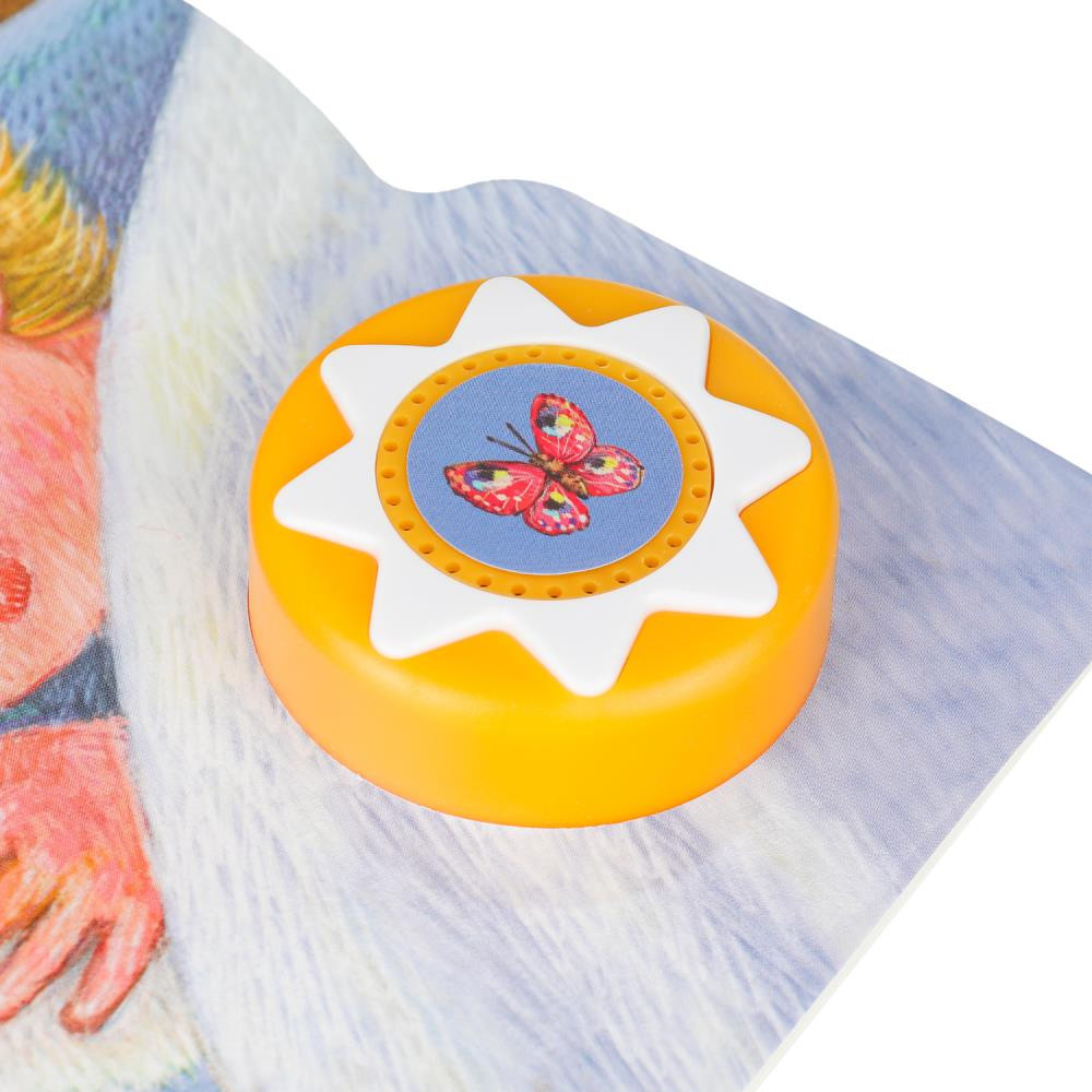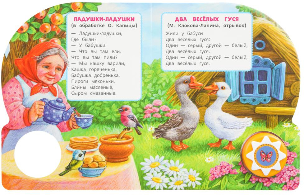 Ребёнок с удовольствием будет листать плотные картонные страницы, рассматривать красочные картинки, нажимать на кнопку и слушать задорные потешки. Малыш легко освоит включение звука: при нажатии на кнопку включится первая песенка, при втором нажатии выключится, в 3-ий раз — заиграет следующая и т.д. Благодаря компактному формату книгу удобно взять с собой в дорогу.