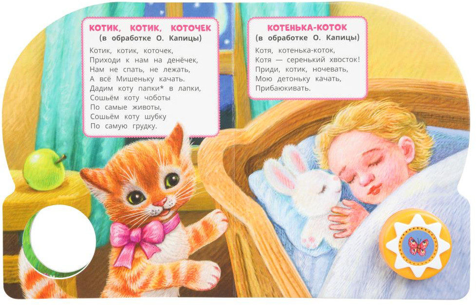 • 10 потешек: «Ладушки-ладушки», «Два весёлых гуся», «Гуси, где вы бывали?», «Божья коровка», «Тень-тень, потетень», «Козлик», «А баиньки, баиньки», «Баю-баюшки-баю», «Котик, котик, коточек», «Котенька-коток»;