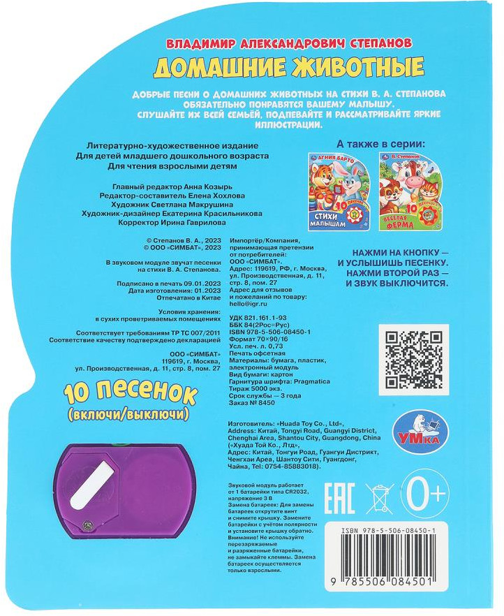 Музыкальная книга «В. Степанов. Домашние животные» ТМ «УМка» станет прекрасным подарком для ребёнка. Малыш будет с удовольствием рассматривать яркие страницы с изображением животных, читать стихи и слушать песенки о них. Одно нажатие на кнопку — песенка включится, второе нажатие — выключится, при третьем нажатии заиграет следующая композиция. Книжка сделана из плотного картона, поэтому родители могут не опасаться, что ребёнок порвёт её. Благодаря компактному формату книгу удобно брать с собой. Чтение музыкальной книги ТМ «УМка» и игра с ней развивают: музыкальный слух, фантазию, образное мышление, внимание и память. |