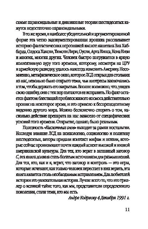 Кислотные сны. Удивительная история секретных программ ЦРУВ данный момент этот товар отсутствует в продаже. Возможно, у нас найдется аналогичный или похожий товар здесь. Серия: Как устроен мир Книга Мартина Ли раскрывает одну из самых темных страниц американской истории: опыты ЦРУ над людьми. В 1940–1960-х годах американская разведка создала целый ряд исследовательских программ, целью которых было заполучить контроль над человеческим разумом. Самые известные из них — «Синешейка» и «Артишок». В ходе экспериментов подопытных накачивали наркотиками, били, лишали сна и подвергали разнообразным пыткам и унижениям. После того, как проект «Синешейка» под давлением общественности был свёрнут, большая часть данных о нём оказалась уничтожена. Многие факты сейчас известны лишь со слов подопытных. Тем не менее, — уверяет нас Мартин Ли, — программы по контролю за разумом не были свёрнуты полностью. Они были засекречены и продолжают действовать до сих пор под руководством докторов-убийц из ЦРУ. |