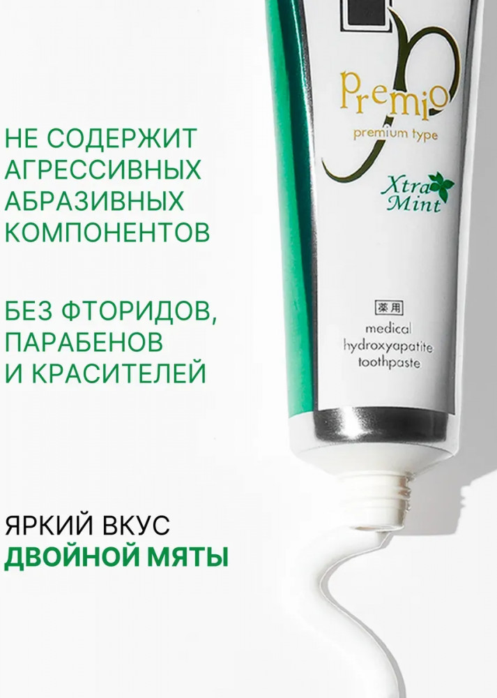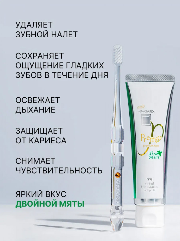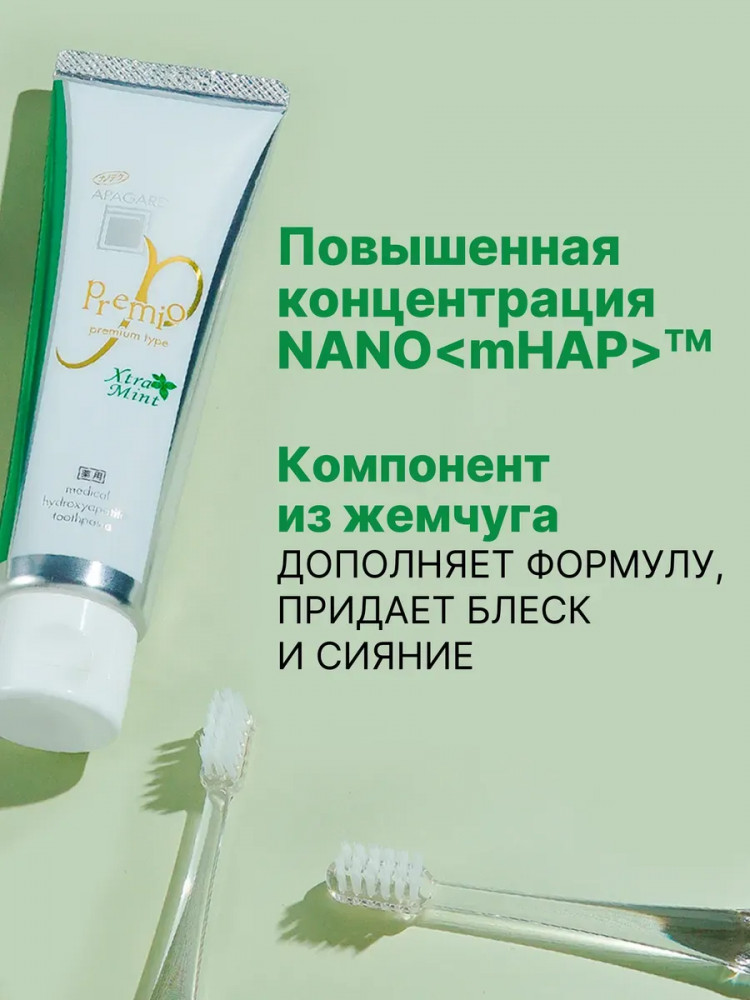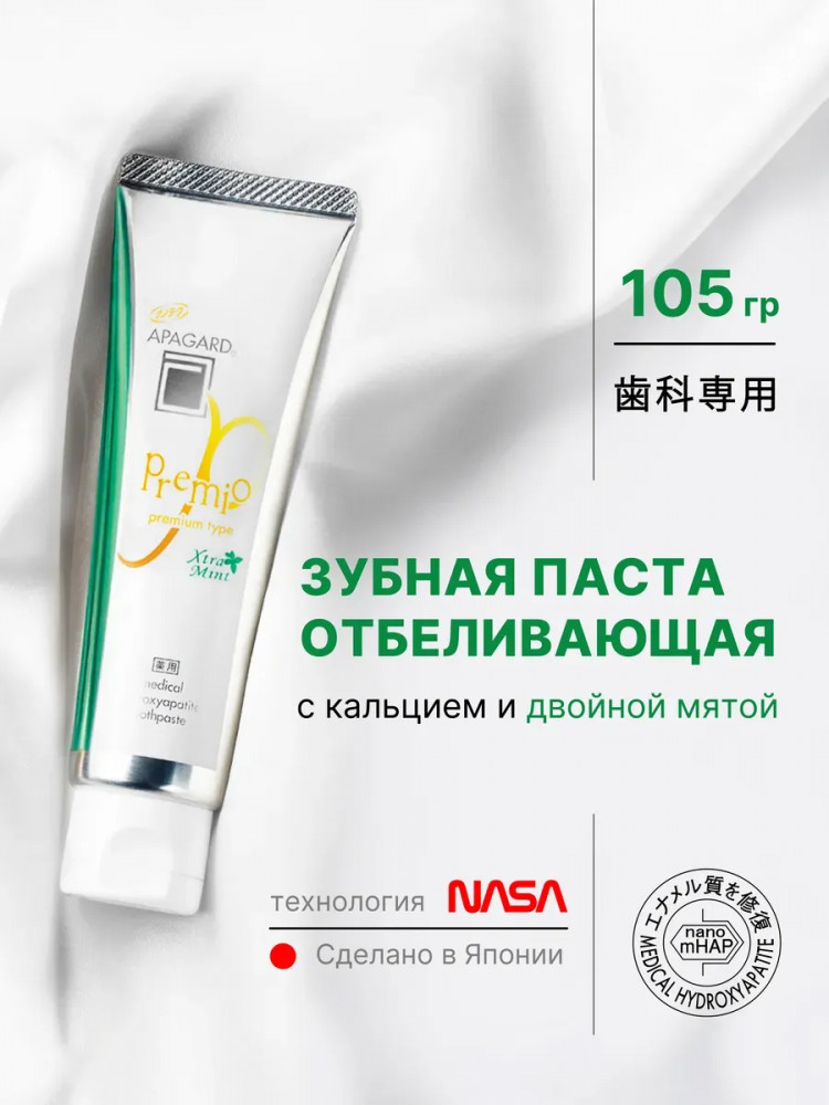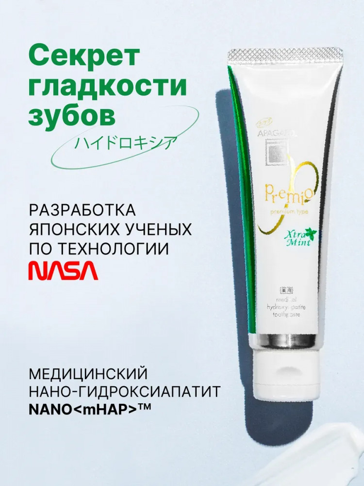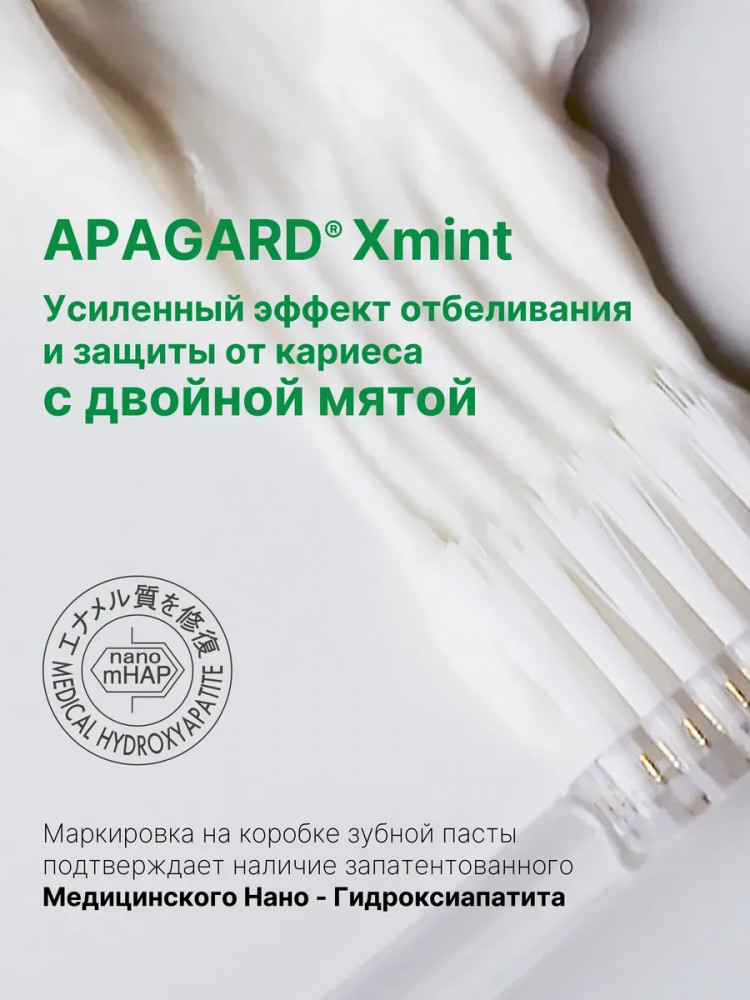 Освежающая зубная паста с двойной мятой из Японии, 105гр. При регулярном использовании, Apagard Premio Xtra mint эффективно борется с запахом изо рта, укрепляет и осветляет эмаль, возвращает ей красивый блеск, снижает повышенную чувствительность зубов, обеспечивает эффективную профилактику кариеса, защищает от зубного камня. Зубная паста без фтора, не содержит SLS, рекомендована для взрослых и подростков. Профессиональная зубная паста содержит экстракт жемчуга и Медицинский Нано-Гидроксиапатит (nano-mHAP) — совместную разработку японских ученых и NASA. Это синтетический аналог биологического гидроксиапатита, минерала, из которого на 97% состоит эмаль зубов и на 70% дентин. Благодаря нано-размеру частиц (до 50 нм), он легко встраивается в микроповреждения на эмали и дентинные канальцы. Наночастицы проникают глубоко в структуру эмали и восстанавливают ее изнутри, в результате зубы становятся гладкими, блестящими и могут посветлеть на пару оттенков.
