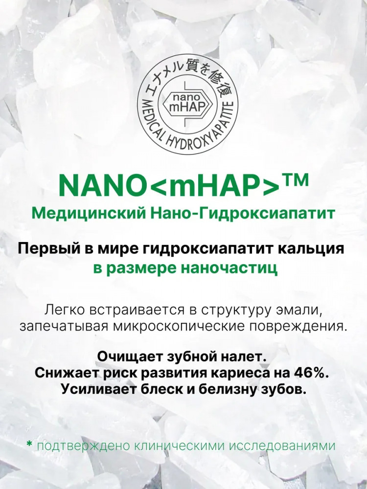 Медицинский Нано-Гидроксиапатит совместим с человеческим костями и зубами, поэтому помогает в процессе минерализации эмали, то есть процессе насыщения эмали минералами, предотвращает развитие кариеса и борется с ним на стадии белого пятна). Входящий в состав Гидроортофосфат кальция эффективно удаляет никотиновый налет с поверхности зубов, очищает зубную эмаль от темных пятен кофе и чая. Кремниевый ангидрид — бережно очищает и полирует эмаль зубов, Цетилпиридиния хлорид — увлажняет слизистую оболочку полости рта, оказывает противовоспалительное и бактерицидное действие, а Бета-глицирризиновая кислота оказывает активное антимикробное и противовоспалительное действие. В зубную пасту так же добавлен экстракт Жемчуга, который придает эмали здоровый и красивый блеск. Подходит для курильщиков.