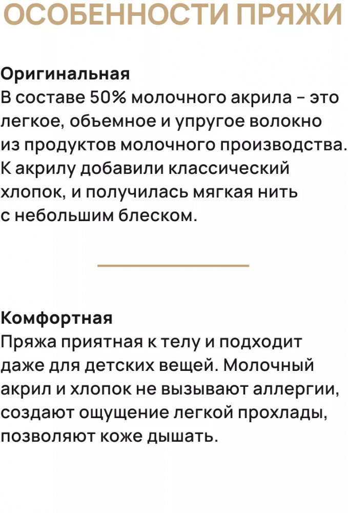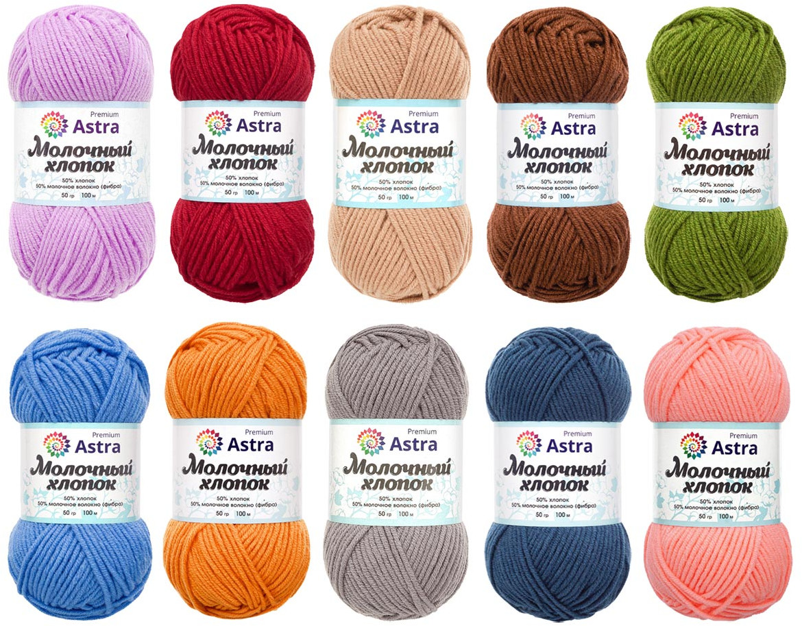 Готовый набор мягкой летней пряжи от Astra Premium «Молочный хлопок» (Milk Cotton) с необычным составом. На 50% она состоит из молочного акрила — этот материал получают из продуктов молочного производства, обрабатывают и вытягивают в нити. Получается легкое объемное волокно. Для прочности молочный акрил смешивают с другими волокнами. Мы добавили хлопок, и получилась очень мягкая пряжа с небольшим блеском. Она создает ощущение прохлады даже в теплую погоду, позволяет коже дышать, комфортна при ношении. Пряжа «Молочный хлопок» содержит естественный увлажнитель, ухаживает за кожей и даже помогает снять аллергические реакции. Молочный акрил известен своими бактерицидными и противогрибковыми свойствами.