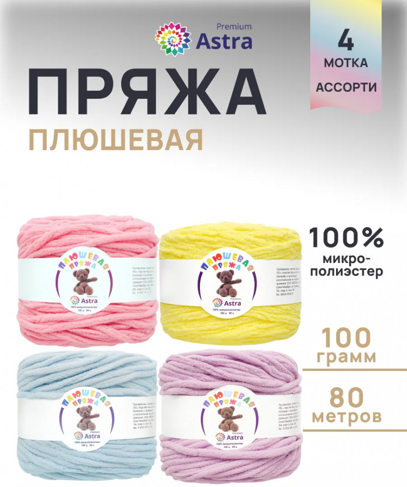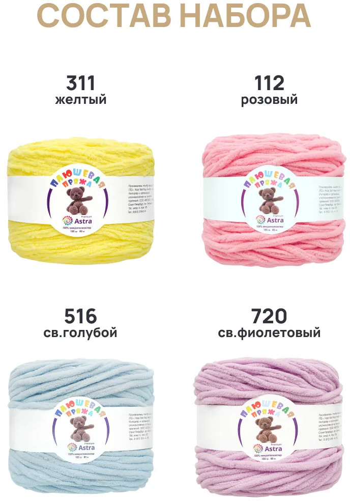 В наборе ассорти представлены 4 оттенка. Плюшевая пряжа производится на современном оборудовании итальянской марки GAUDINO, известной своими высокими стандартами качества.