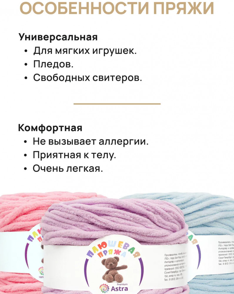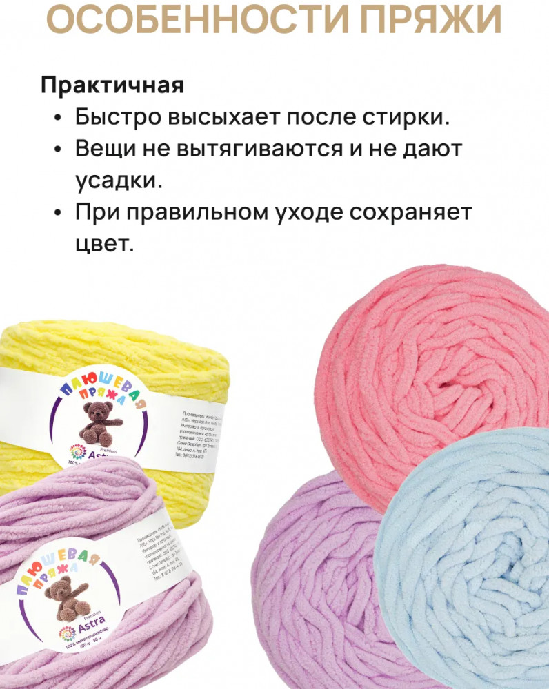 Пряжа Плюшевая от Astra Premium — это пряжа нежной текстуры с тончайшим пушистым ворсом, который придает изделиям объем, мягкость и ощущение комфорта. Нить плюшевой пряжи изготавливается из 100% микрополиэстера — материала, который не раздражает кожу и обладает рядом преимуществ. Микрополиэстер известен своей прочностью, устойчивостью к деформации и выцветанию. Благодаря этому изделия из Плюшевой пряжи сохраняют свою форму и яркость цвета на протяжении длительного времени, даже после многочисленных стирок. Из нее можно связать теплый и уютный свитер свободного кроя, который подарит комфорт в холодную погоду. Также она отлично подойдет для создания мягких игрушек. И, конечно же, Плюшевая пряжа — идеальный выбор для вязания пледов, которые создадут в вашем доме атмосферу тепла и уюта.
