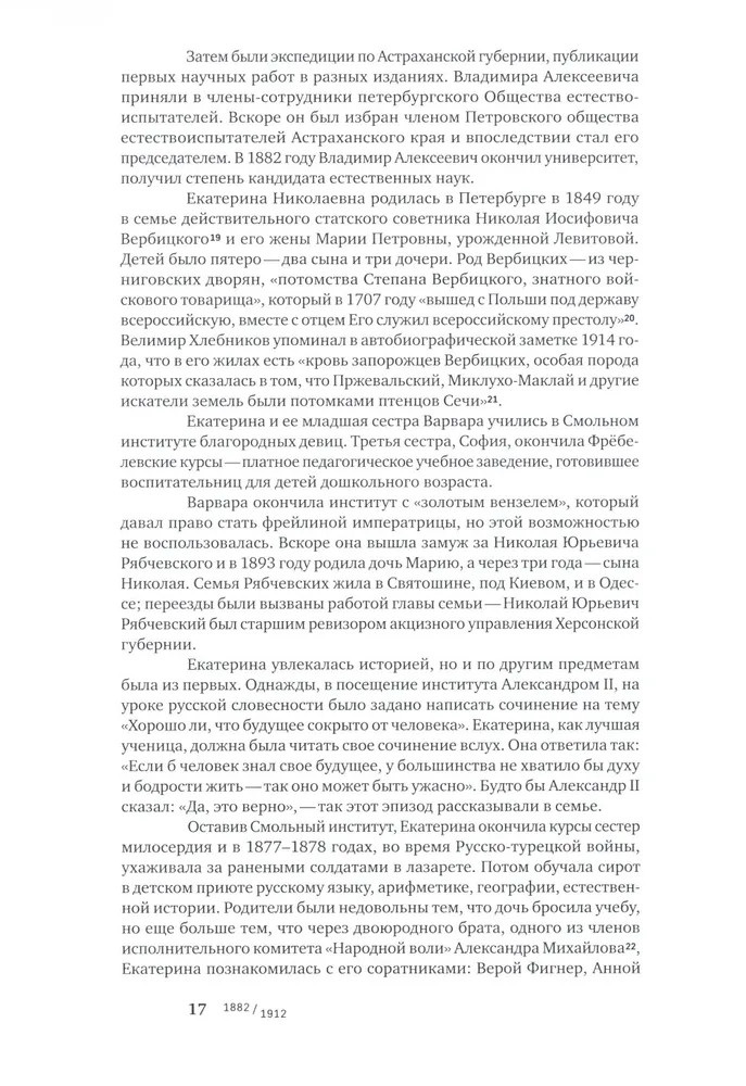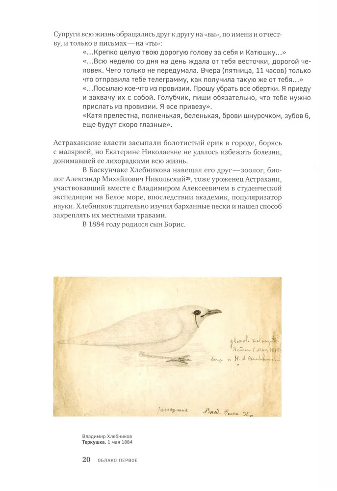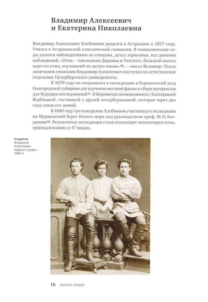 «Облака» — это хроника семьи Хлебниковых, составленная Верой Маевной Митурич-Хлебниковой из архивных материалов. Письма и воспоминания, многие из которых публикуются впервые, проиллюстрированы 300 фотографиями, рисунками и живописными работами из семейного архива и музейных собраний. Перед нами предстают не только яркие судьбы героев, но и бурная культурная жизнь России первых десятилетий прошлого века. Отец семейства Владимир Алексеевич Хлебников — ученый-орнитолог, один из организаторов и директор Астраханского биосферного заповедника, первого в стране. В книге прослеживаются пути его детей, наделенных разнообразными талантами: формирование гения Велимира Хлебникова, творческие поиски его сестры, художницы Веры Хлебниковой, и брата Александра, изобретателя и ученого-естественника. |