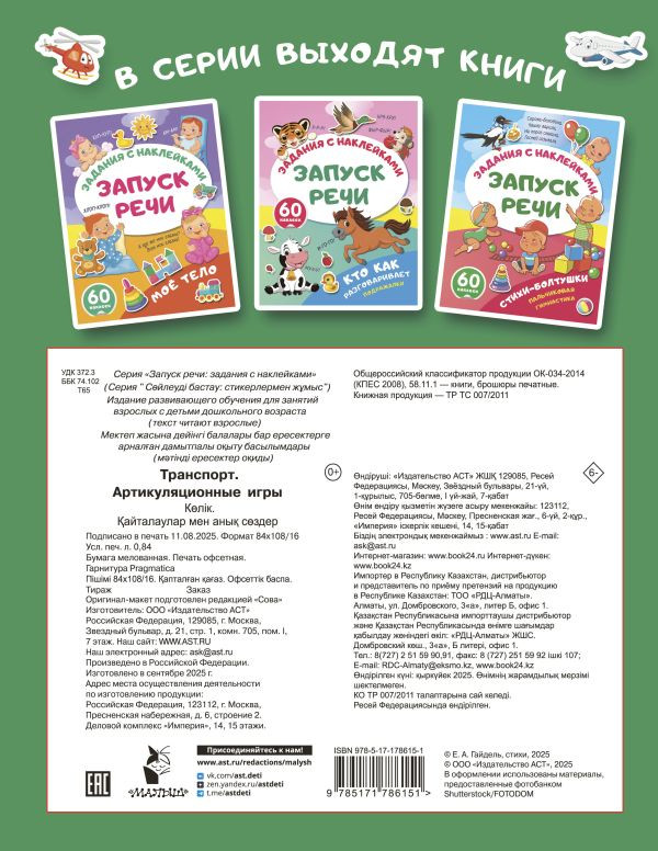 Серия: Запуск речи: задания с наклейками Книга «Транспорт. Артикуляционные игры» — то что нужно для запуска речи у малышей. Как помочь ребёнку начать произносить первые слова и разговориться? Предложите ему маленькие упражнения для щёк, губ и язычка — в лёгкой игровой форме ребёнок научится чисто выговаривать звуки, чётко и внятно произносить слова. Выполнять задания будет легче и интереснее, если использовать небольшое зеркальце. На первых порах малыш будет слушать весёлые потешки и показывать транспорт на страницах, а затем станет прислушиваться к похожим по звучанию словам, различать их на слух. Ведь без развития артикуляционной моторики и речевого слуха невозможно научиться говорить правильно. В книге 60 красочных стикеров с хорошей печатью: легко отделяются от основы и идеально подойдут для детских пальчиков. |