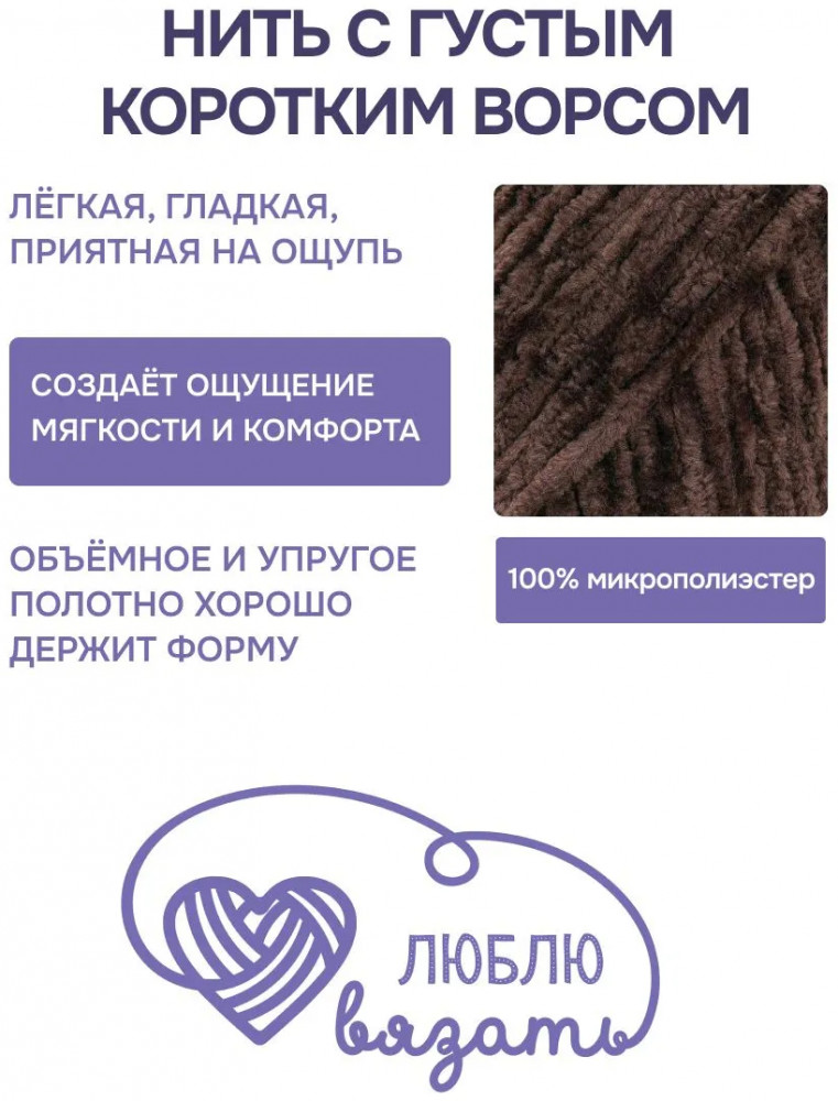 Велюровая пряжа от бренда Люблю вязать — выбор для тех, кто ценит практичность, комфорт и ищет материал для новых проектов. Пряжа неслучайно называется велюровой: по всей длине она покрыта тончайшим ворсом. Ворс короткий и густой, но при этом очень упругий и гладкий. Нежные ворсинки приятны для любой кожи, даже самой чувствительной. Кроме того, они создают воздушную прослойку, которая задерживает тепло и создает ощущение уюта. Велюровая пряжа — практичный выбор. Она изготовлена из 100% полиэстера: волокно очень легкое, отталкивает грязь и не привлекает моль. Ворс остается гладким и не скатывается. Из Велюровой пряжи получаются замечательные мягкие игрушки, с которыми приятно играть и обниматься, а также уютные покрывала и воздушные накидки.