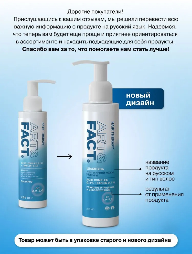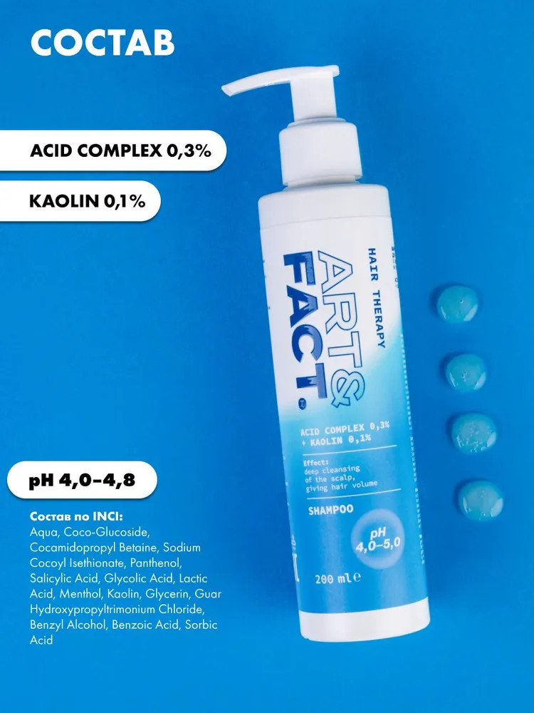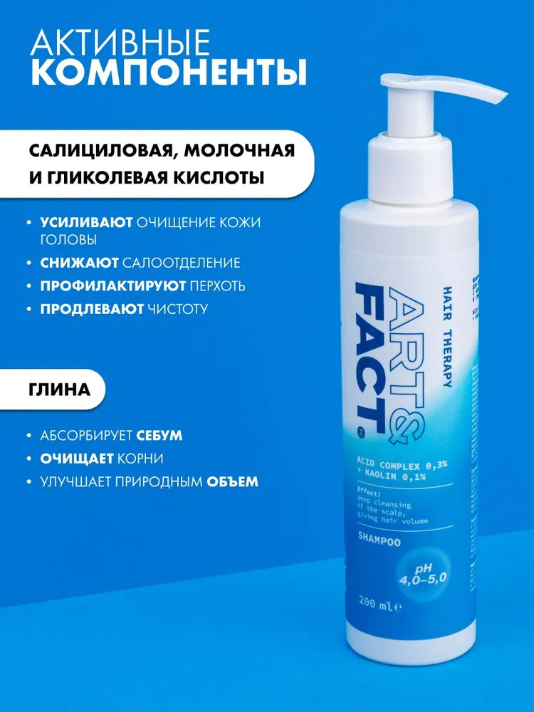 Art&Fact Шампунь глубокой очистки для жирных волос с комплексом кислот 0,3% и глиной 0,1%