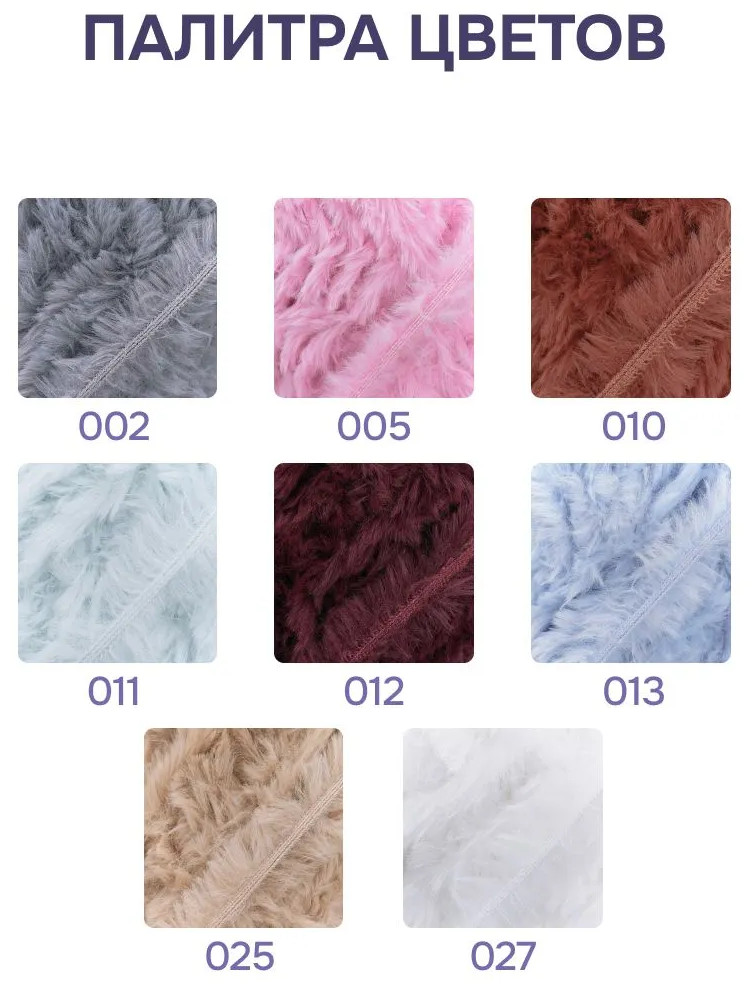 Пряжа с меховой текстурой — превосходное решение для вязания предметов интерьера, таких как пледы и коврики, а также объемной одежды, включая свитера, накидки и стильные шарфы. Для создания небольшой игрушки амигуруми потребуется 1-3 мотка, для шарфа — 2-6 мотков. На большой плед понадобится 10-15 мотков.