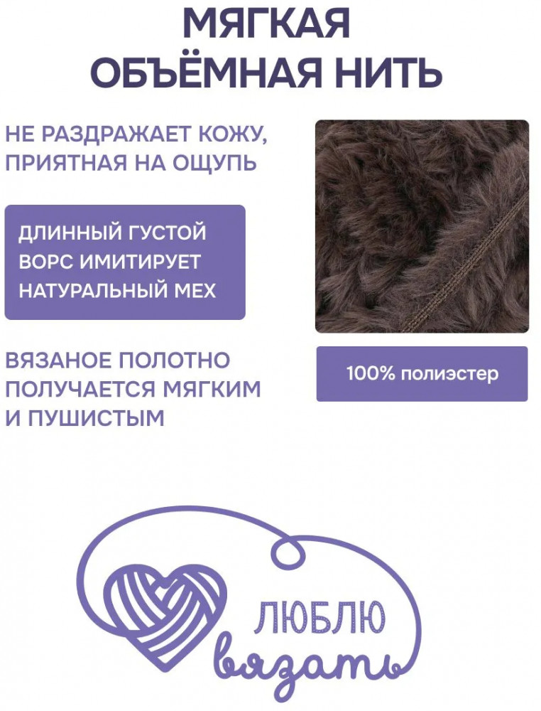 Пряжа для вязания Мех от бренда Люблю вязать- это нить с длинным, деликатным ворсом, полностью состоящая из полиэстера. Эта пряжа объединяет тактильные ощущения меха с надежностью синтетического материала. Её невесомость и гипоаллергенность делают её подходящей даже для создания детских изделий, таких как пледы и игрушки. Связанные из неё вещи отличаются уютом, воздушностью и объемом. После стирки они не теряют первоначальный вид, не образуют катышков, а длинный ворс остается на месте.