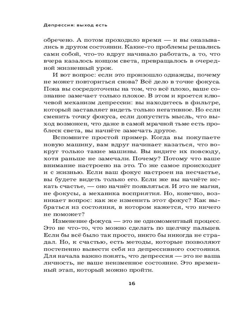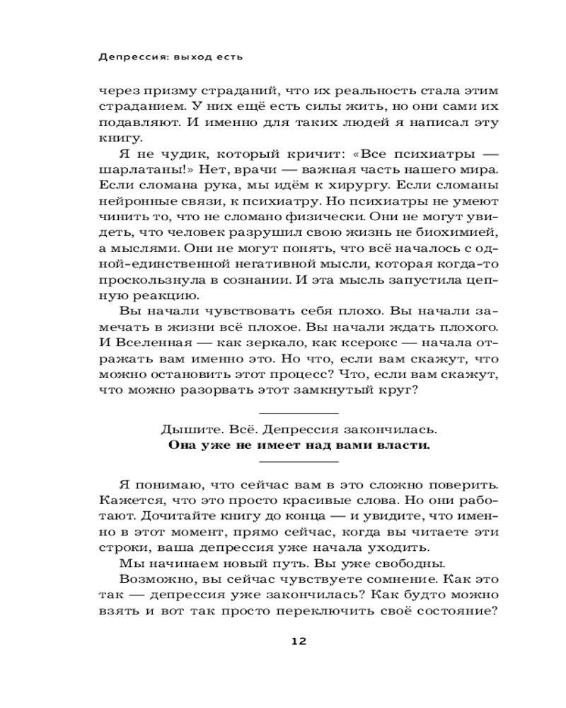 Серия: Душа и тело. Книги для развития себя «Депрессия: выход есть» — это не утешение на пару часов, а понятная и рабочая система возвращения к жизни. Коуч по саморазвитию Петр Лупенко прошел собственный путь через алкогольную зависимость, сбросил 40 кг и создал метод, который помогает выбраться из темноты шаг за шагом — бережно, экологично и без пустых обещаний.