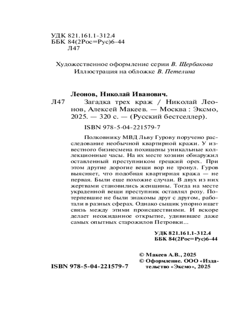 Серия: Русский бестселлер (обложка) Полковнику МВД Льву Гурову поручено расследование необычной квартирной кражи. У известного бизнесмена похищены уникальные коллекционные часы. На их месте хозяин обнаружил оставленный преступником грецкий орех. При этом другие дорогие вещи вор не тронул. Гуров выясняет, что подобная квартирная кража — не первая. Были еще похожие случаи. В двух из них жертвами становились женщины. Тогда на месте украденной вещи преступник оставлял розу. Потерпевшие не были знакомы друг с другом, работали в разных сферах. Однако сыщик упорно ищет связь между этими происшествиями. И вскоре делает неожиданное открытие, удивившее даже самых опытных старожилов Петровки... |