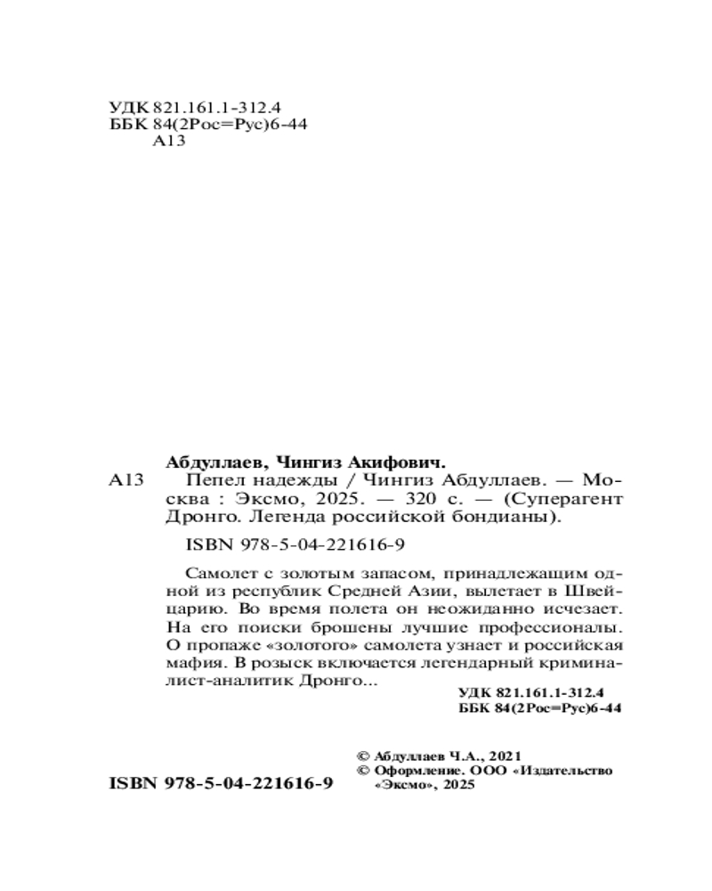 Серия: Суперагент Дронго. Легенда российской бондианы Самолет с золотым запасом, принадлежащим одной из республик Средней Азии, вылетает в Швейцарию. Во время полета он неожиданно исчезает. На его поиски брошены лучшие профессионалы. О пропаже «золотого» самолета узнает и российская мафия. В розыск включается легендарный криминалист-аналитик Дронго... |