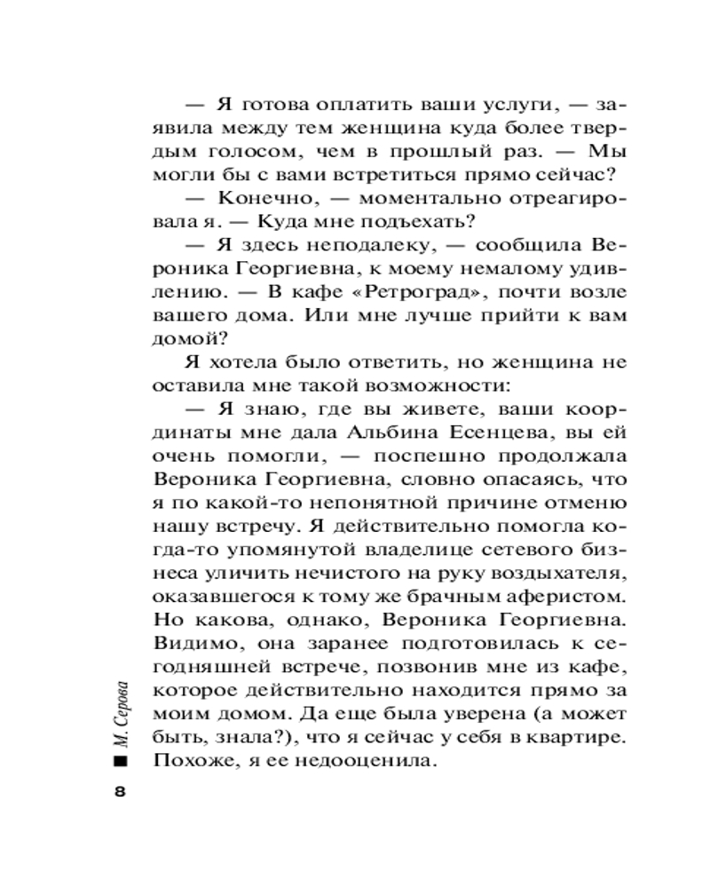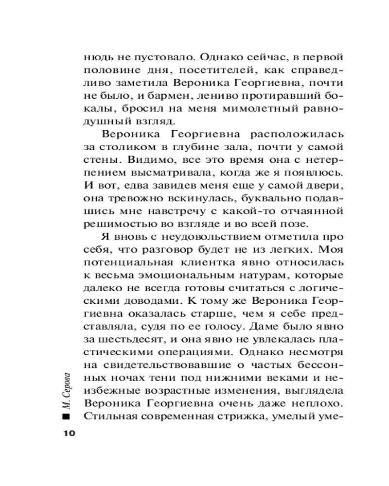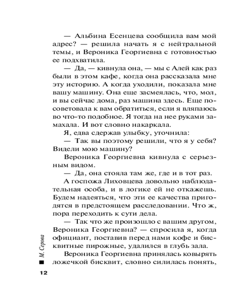 Марина Сергеевна Серова — один из ведущих авторов серии современного русского детективного жанра (существует версия, что это коллектив авторов под общим руководством литературного агента Сергея Потапова). Согласно легенде, «выпускница юридического факультета МГУ, работала в Генеральной прокуратуре, сотрудница одной из спецслужб, участвовала в боевых операциях». Между тем написала 425 произведений размером порядка 200 страниц (и число их постоянно увеличивается). Часть произведений... |
