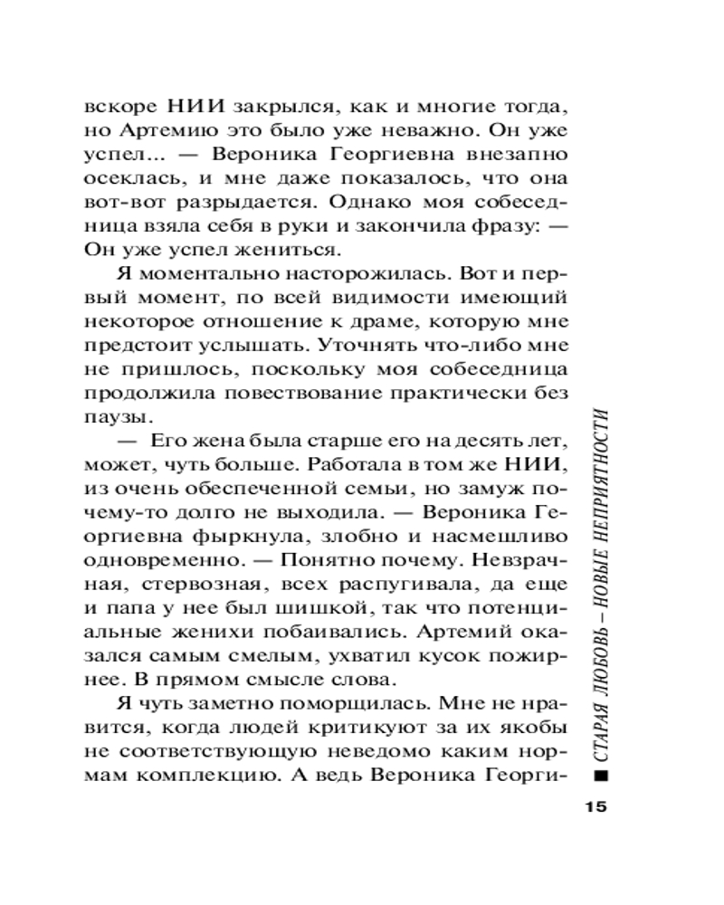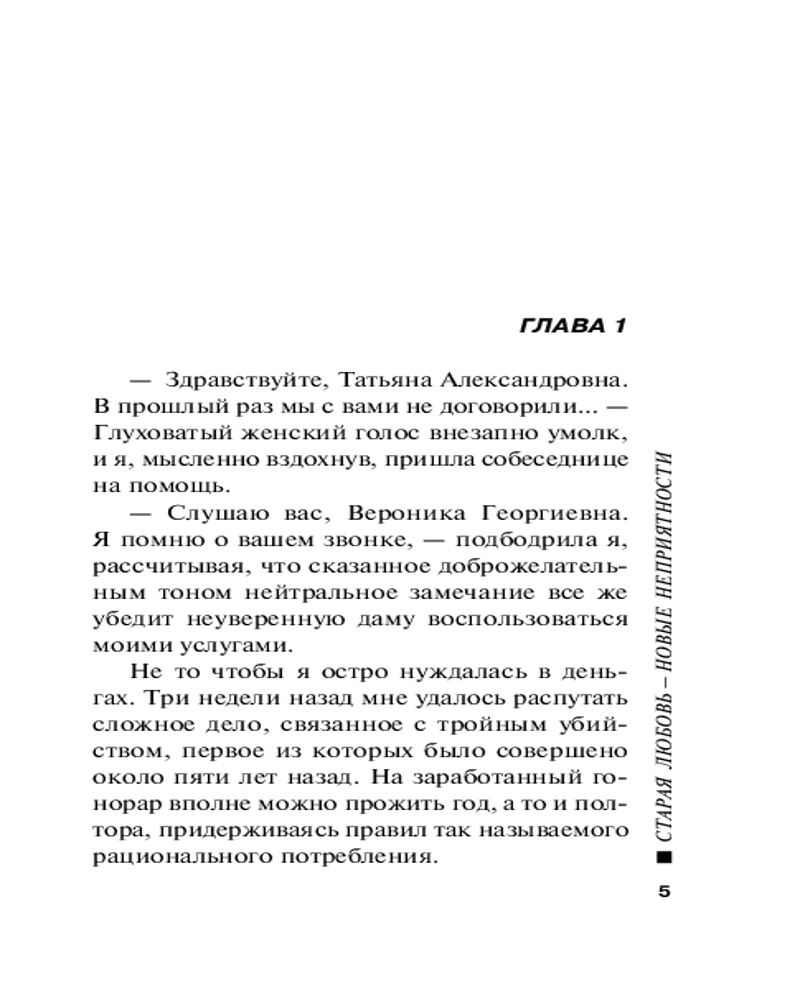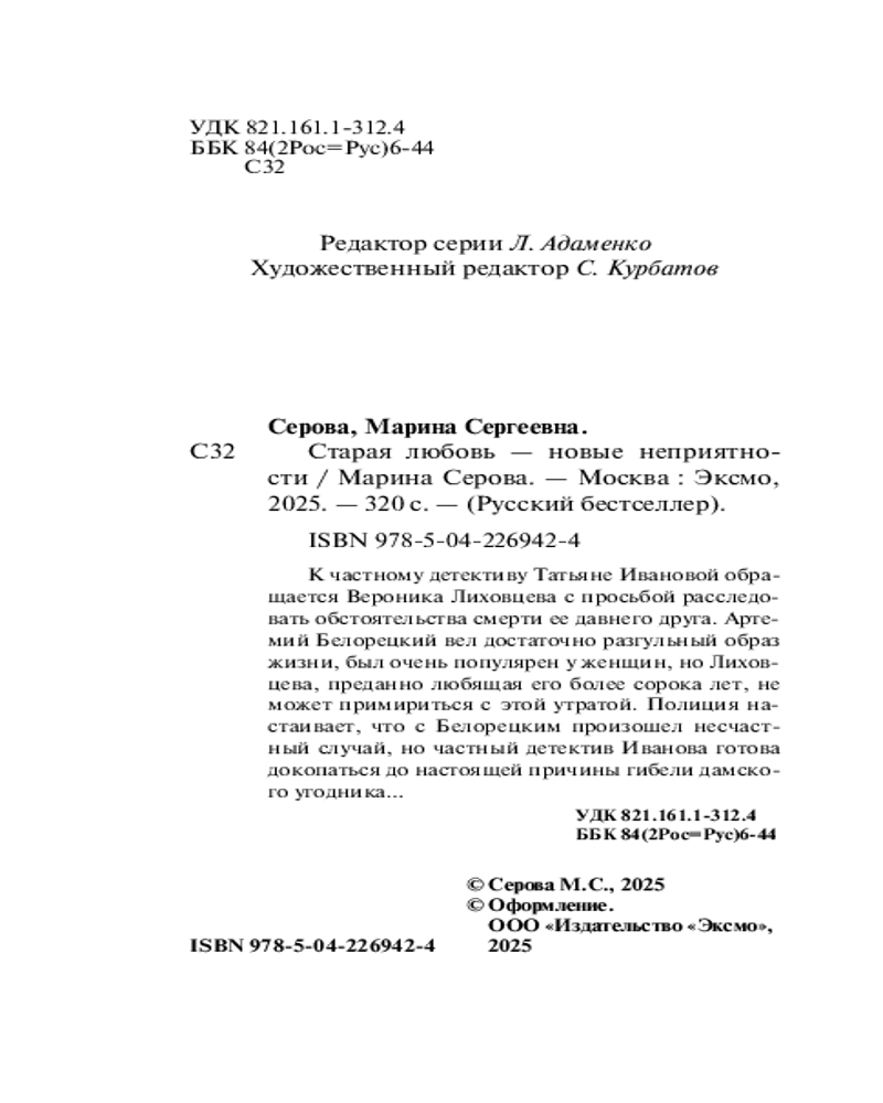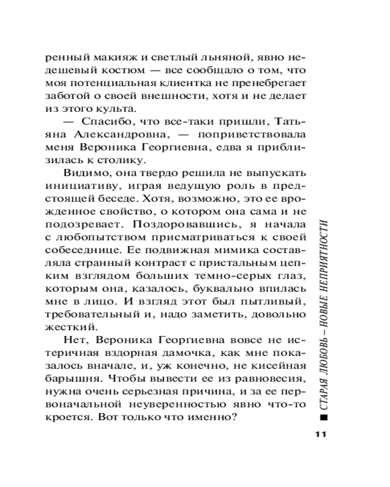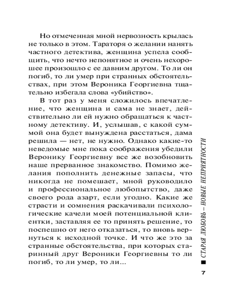 Серия: Русский бестселлер (обложка) К частному детективу Татьяне Ивановой обращается Вероника Лиховцева с просьбой расследовать обстоятельства смерти ее давнего друга. Артемий Белорецкий вел достаточно разгульный образ жизни, был очень популярен у женщин, но Лиховцева, преданно любящая его более сорока лет, не может примириться с этой утратой. Полиция настаивает, что с Белорецким произошел несчастный случай, но частный детектив Иванова готова докопаться до настоящей причины гибели дамского угодника... |