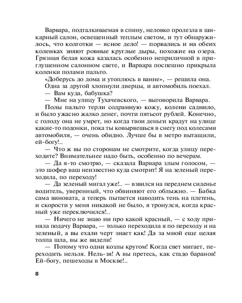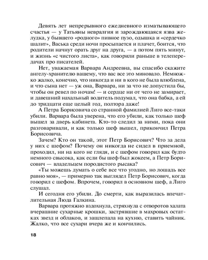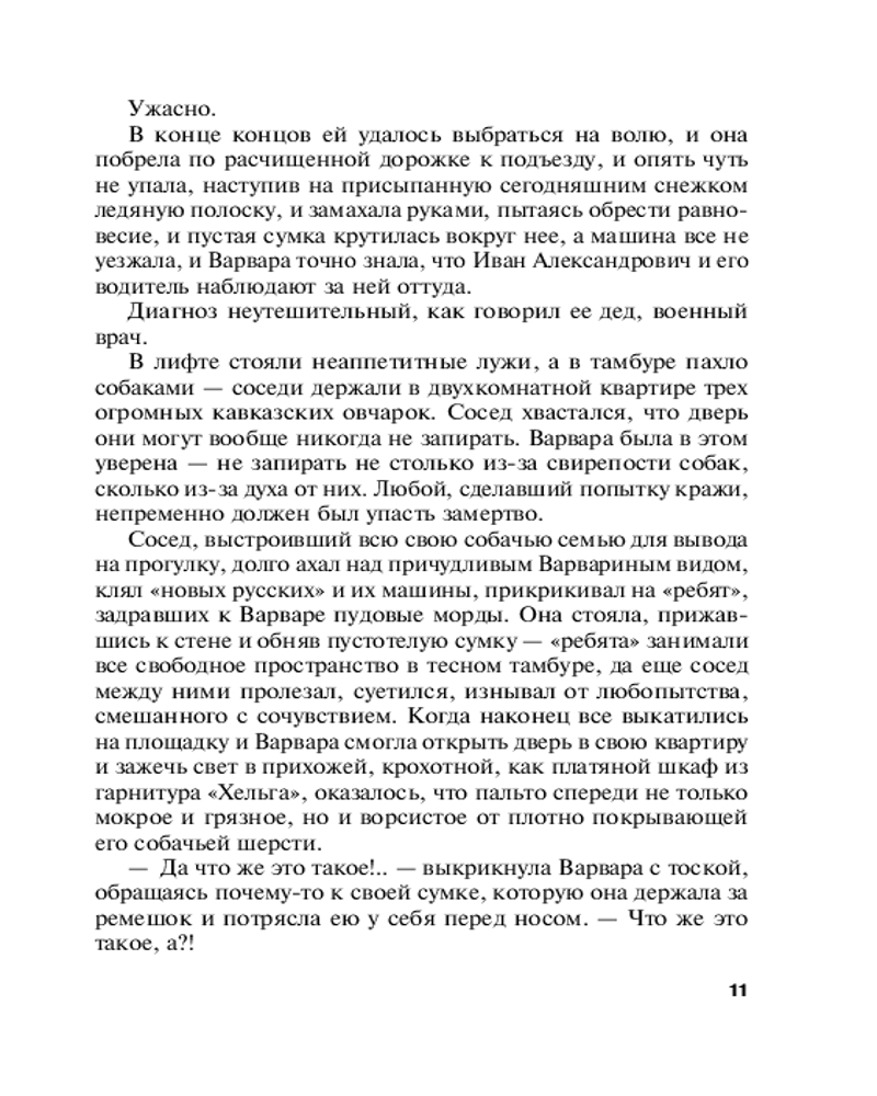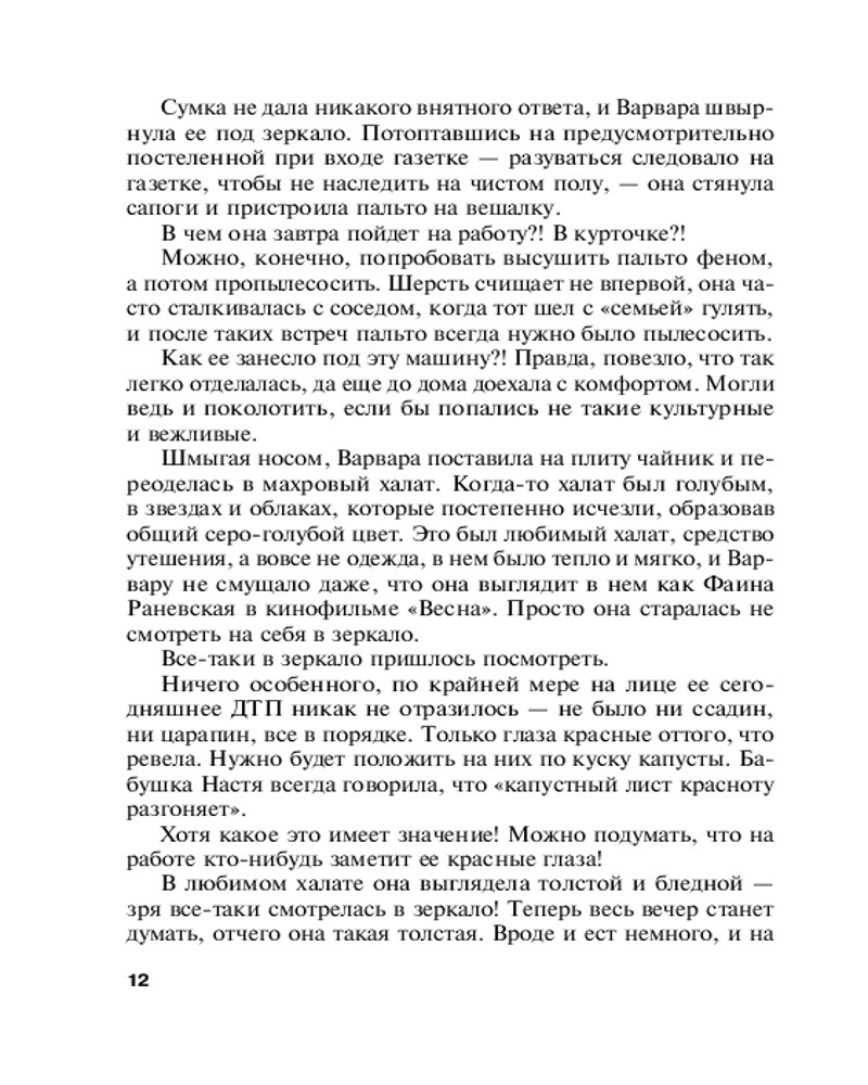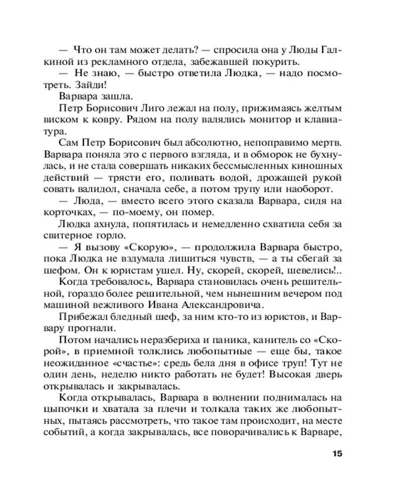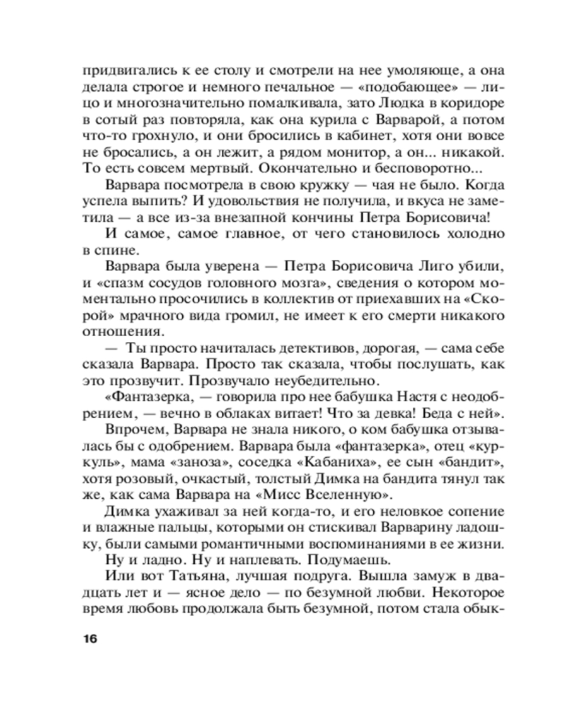 Серия: Татьяна Устинова: лучшее (обложка) Одиноко и бедно жила немолодая девушка Варвара Лаптева. Казалось, все, что только есть в жизни хорошего, обошло ее стороной. Начальство на работе считало ее непроходимой дурой, да и сама Варвара махнула на себя рукой. Но, видно, не до конца... Череда странных событий выбивает ее из привычного рутинного течения жизни. В кабинете начальника вдруг умирает посетитель. Варвара — первый человек, который увидел его мертвым. В это же самое время из кабинета исчезает пластиковая карта, на которой лежит ни много, ни мало — полмиллиона швейцарских франков! И Варвару начинают преследовать неизвестные, уверенные в том, что именно она похитила эти деньги. Разумеется, она непричастна. Но тогда кто?.. |