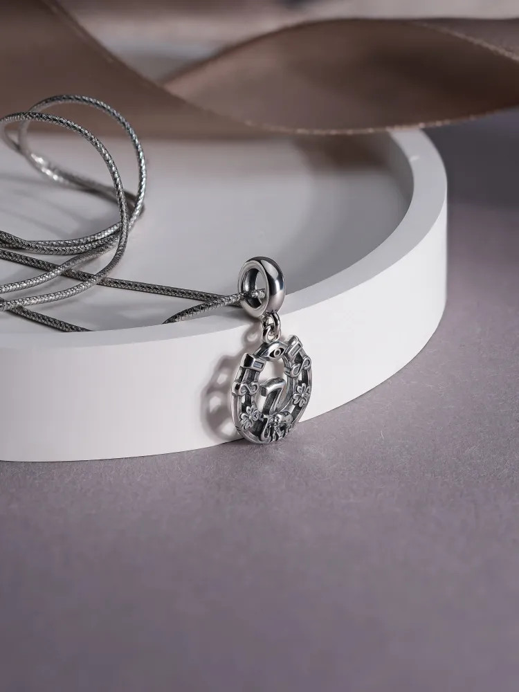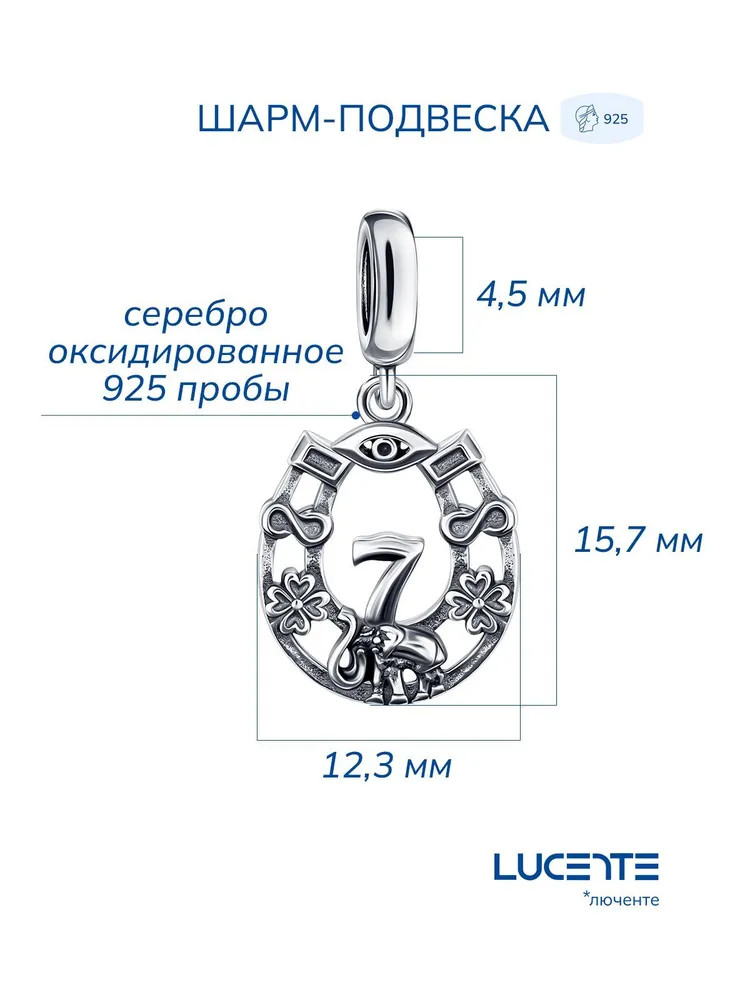 Шарм серебро прекрасно смотрятся как в одиночку, так и в наборе шармов, подойдет на браслет, на гайтан, на текстильный, кожаный, каучуковый шнурок. Серебряные шармы также могут использоваться в качестве подвески и кулона на цепочку. Шарм подвеска выполнен из серебра 925 пробы с оксидированным покрытием (частичное чернение). Высота подвески без входного ушка 15,7 мм. Ширина 12,3 мм. Диаметр входного отверстия 4,5 мм. Шарм односторонний.