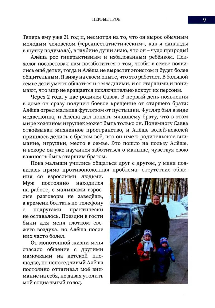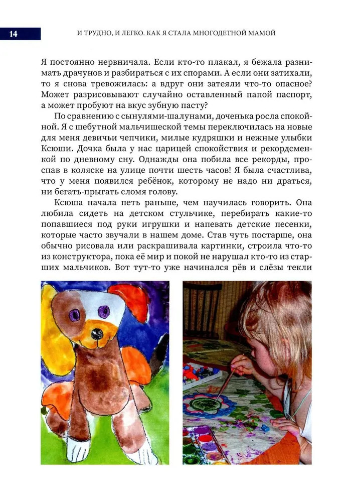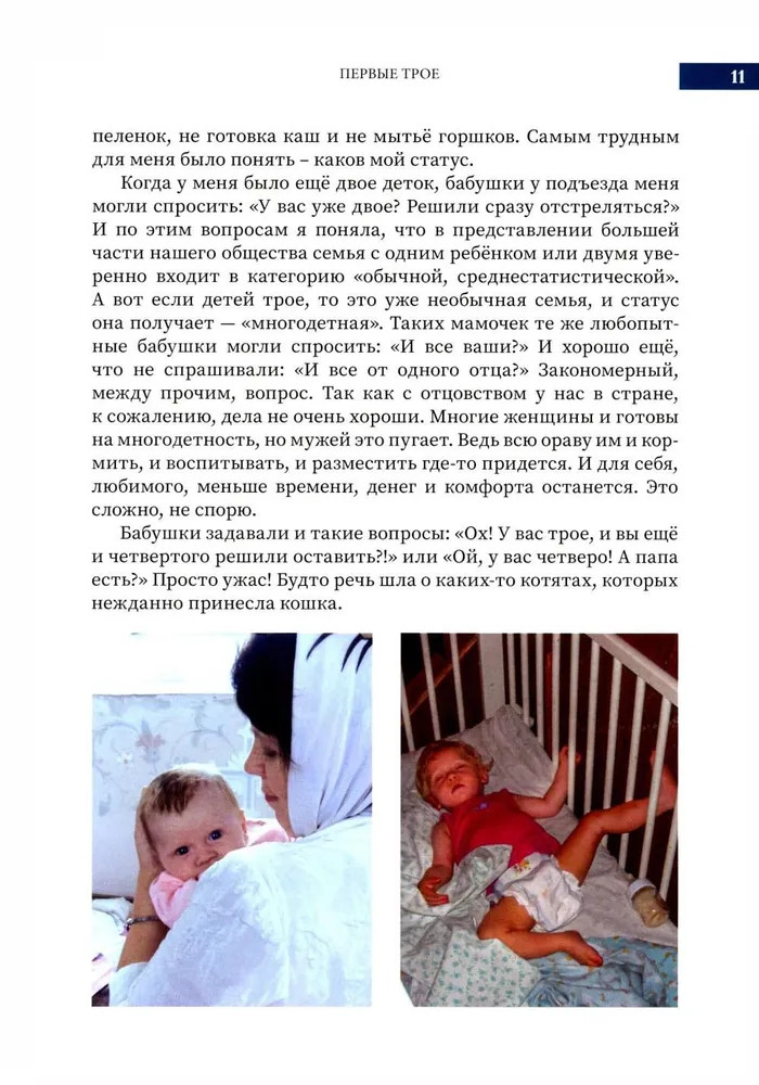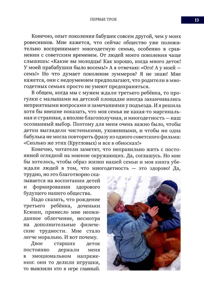 Книга представляет собой очерки многодетной мамы, в которые она включила фотоальбом своей семьи. Эта честная, искренняя и светлая книга очень убедительна в противовес привычному в обществе мнению о том, что иметь многодетную семью неимоверно тяжело, а порой и невозможно. По мнению Т. Малицкой, большая и крепкая семья может и должна стать нормой в России, как это было испокон веков. Размышления и опыт автора, возможно, помогут семьям с детьми в непростом, но очень ресурсном пути, а сомневающимся вселят надежду, что дорогу обязательно осилит идущий. Издание предназначено для широкого круга читателей.  |