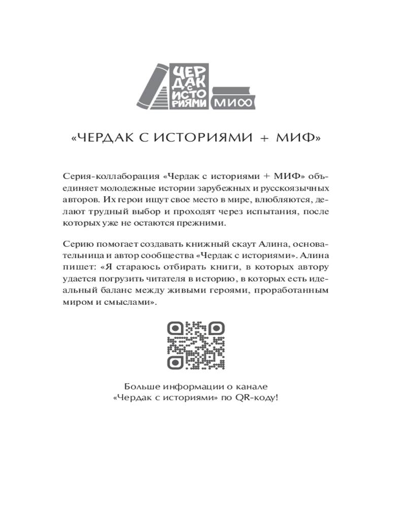 Серия-коллаборация «Чердак с историями + МИФ» объединяет сложные истории Young Adult зарубежных и русскоязычных авторов. Герои их романов ищут свое место в мире, влюбляются, делают трудный выбор и проходят через испытания, после которых уже не остаются прежними.