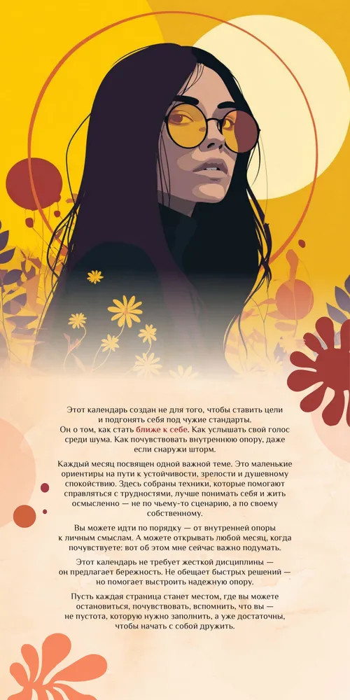 Серия: Календарь настенный на 2026 год Этот календарь о том, как стать ближе к себе. В каждом месяце дана полезная информация и эффективная техника по одной из 12 важных психологических тем. Пусть каждая страница станет местом, где вы можете остановиться, почувствовать, вспомнить, что вы — не пустота, которую нужно заполнить, а уже достаточны, чтобы начать с собой дружить. |