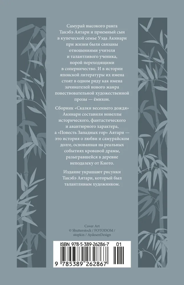 Серия: Изящная классика Востока Самурай высокого ранга Такэбэ Аятари (1719–1774) и приемный сын в купеческой семье Уэда Акинари (1734–1809) при жизни были связаны отношениями учителя и талантливого ученика, порой переходящими в соперничество. И в истории японской литературы их имена стоят в одном ряду как имена зачинателей нового жанра повествовательной художественной прозы — ёмихон. |