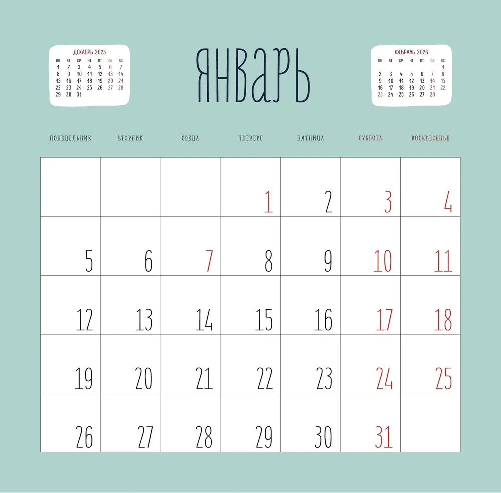 Серия: Календари настенные 2026 (300×300) Календарь настенный на 2026 год — это стильный и функциональный аксессуар, который органично дополнит ваш интерьер и поможет легко планировать важные события и моменты. Его четкий дизайн и удобный формат делают его незаменимым помощником в организации времени, добавляя пространству порядка и уюта. |