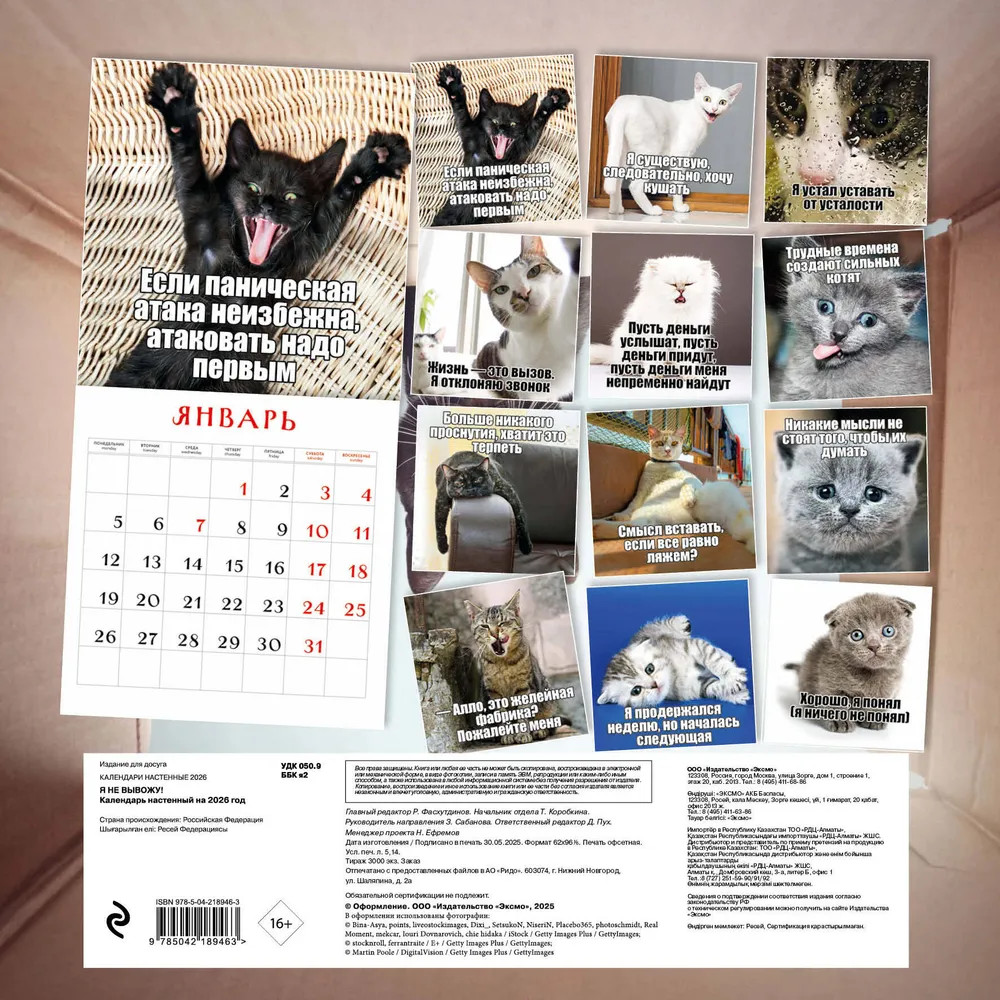 Серия: Календари настенные 2026 (300×300) Календарь для самых уставших! С ним вы будете начинать каждый день со здоровой порции самоиронии, что точно подбодрит и придаст сил на день (ну хотя бы чуть-чуть). Каждый новый месяц вас будет встречать мем с котиком, который уже всё в этой жизни понял, и поднимать настроение. Также внутри календаря вас ждет крупная сетка с основными праздниками и местом для записи важных событий. Удобный формат 300×300 мм позволит повесить его абсолютно везде. Отличный подарок себе и другу! |