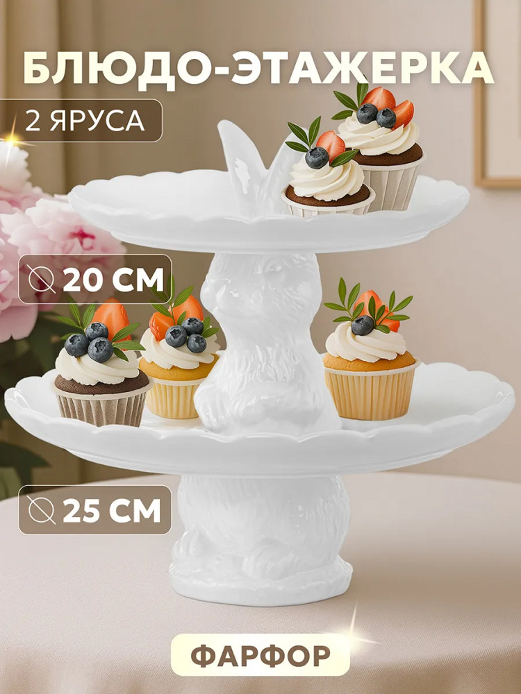 Двухярусное блюдо-этажерка «Кролик» предназначено для эстетичной сервировки вашего стола. Размер изделия — 25,5×25,5×23,5 см, размер верхнего блюда — 20×20×1 см, нижнего — 25,5×25,5×1 см. Расстояние между ярусами — 9 см. Высота ножки — 7 см. Изделие выполнено из высококачественного белого фарфора. Он не впитывает цвет продуктов и легко отмывается, благодаря чему надолго сохранит свою белизну. Каркас представляет собой фигурку кролика. Такое блюдо станет изысканным и функциональным решением для сервировки ваших любимых закусок. Расположите на ажурных тарелочках бутерброды, канапе, роллы или суши. Заполните их мясной и сырной нарезкой, кусочками овощей, фруктами и свежей зеленью. Задействуйте в качестве конфетницы: заполните блюдца конфетами, мармеладом, зефиром, безе, а также домашней выпечкой, пирожными и другими кондитерскими изделиями. Два яруса обеспечат достаточно места для любого угощения, благодаря чему этажерка станет незаменимым элементом любого праздника!