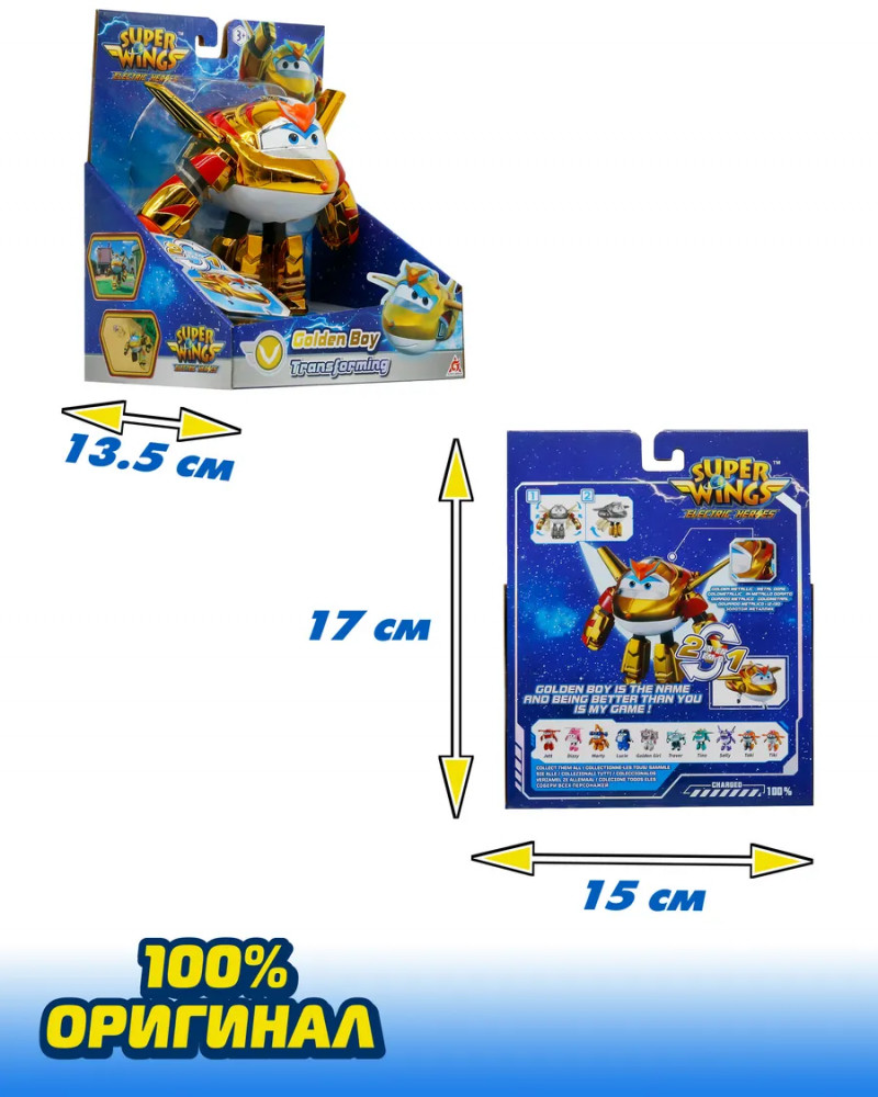 Детский трансформер 2 в 1 Голден Бой из команды 8 сезона Супер Крыльев: Электрические Герои — удивительная игрушка, которая перенесет вашего ребенка в сказочный мир веселых игр с любимыми героями популярного мультика Super Wings! Голден Бой станет отличным подарком для маленьких поклонников. Удивительным образом из сильного Робота он за 8 шагов превращается в скоростной Самолет и уже готов отправляться за приключениями со своими друзьями! Яркие цвета, качественные материалы, ноги и крылья, которые могут двигаться — привлекут внимание каждого малыша! Трансформеры с подвижными элементами не только добавляют разнообразия игре, но и способствуют развитию мелкой моторики и координации движений, что особенно важно во время активного роста детей! Собери всю коллекцию друзей Голден Боя! |