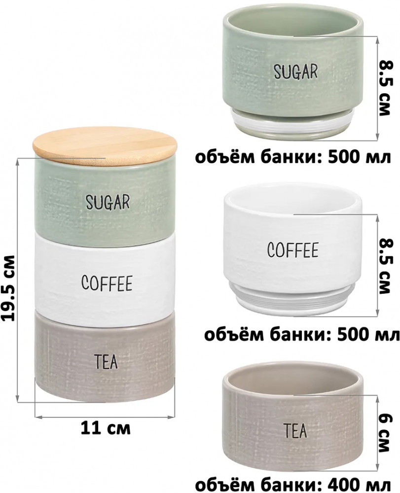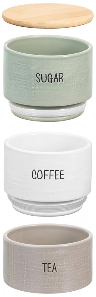 Набор 3 банок для сыпучих продуктов от бренда Elan Gallery станет удобным и эстетичным дополнением вашей кухни. Разноцветные баночки штабелируются и крепко прилегают одна к другой за счёт силиконовых уплотнителей. Образуется единая крепкая конструкция-пирамидка размером 11×11×19,5 см, без крышки её высота 18,5. Пирамиду завершает крышка из натурального бамбука, которая тоже оснащена силиконовым уплотнителем и надежно защищает продукты от пыли и влаги. Круглые ёмкости выполнены из плотного доломита. Формочки украшены надписями «Sugar"(«Сахар»),"Coffee"(«Кофе»),"Tea"(«Чай»). Размер верхней баночки зелёного цвета 11×11×6 см, объём 400 мл. Параметры нижних банок белого и серого цветов: размер каждой — 11×11×8,5 см, объём — 500 мл. Банки для сыпучих продуктов позволят красиво хранить продукты на полке или в шкафу. Благодаря стильному дизайну подходят для эстетичного хранения на столе, а также для сервировки. Комплект из кофейной баночки, сахарницы и чайного контейнера станет элементом декора вашей кухни.